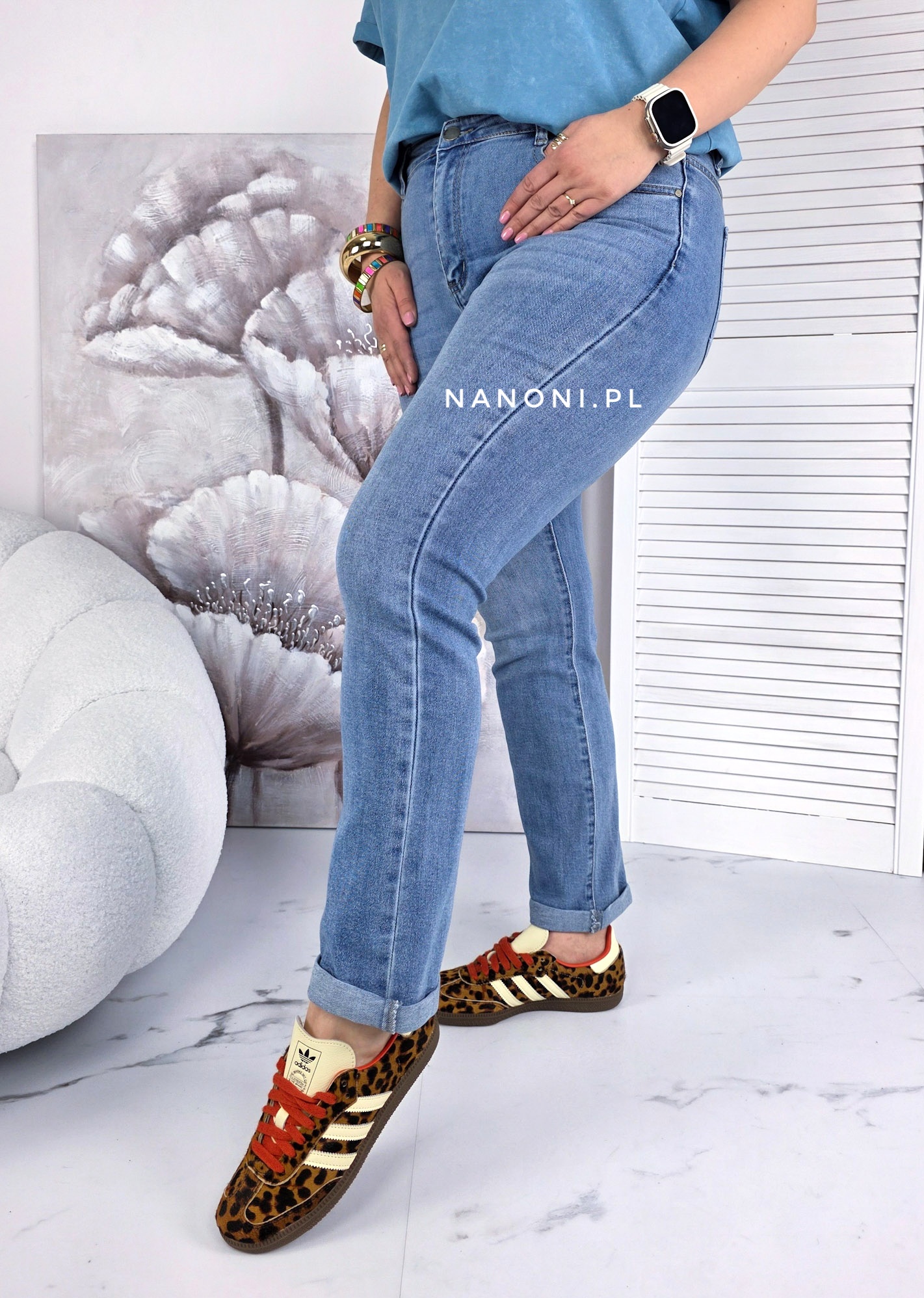 Spodnie jeansy niebieskie plus size o klasycznym fasonie, z delikatnie prostą nogawką. Nogawka jest podwinięta.