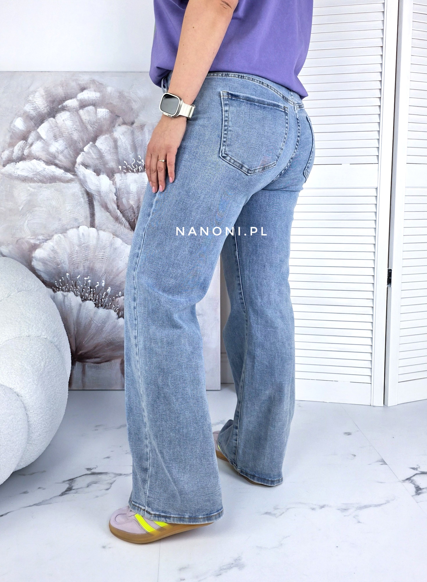 Spodnie jeansy niebieskie proste plus size z szeroką nogawką. Spodnie są ze średniej grubości jeansu.