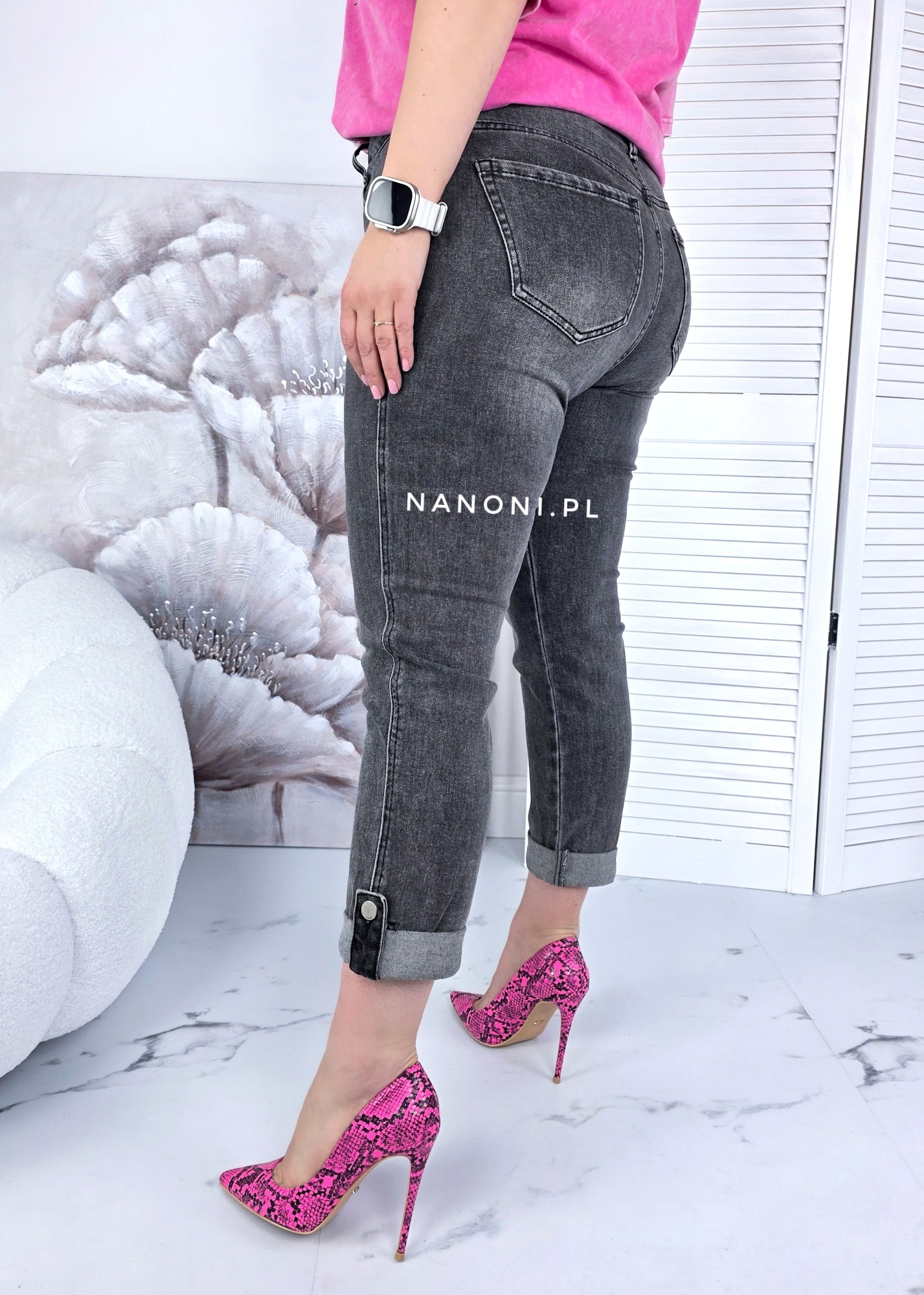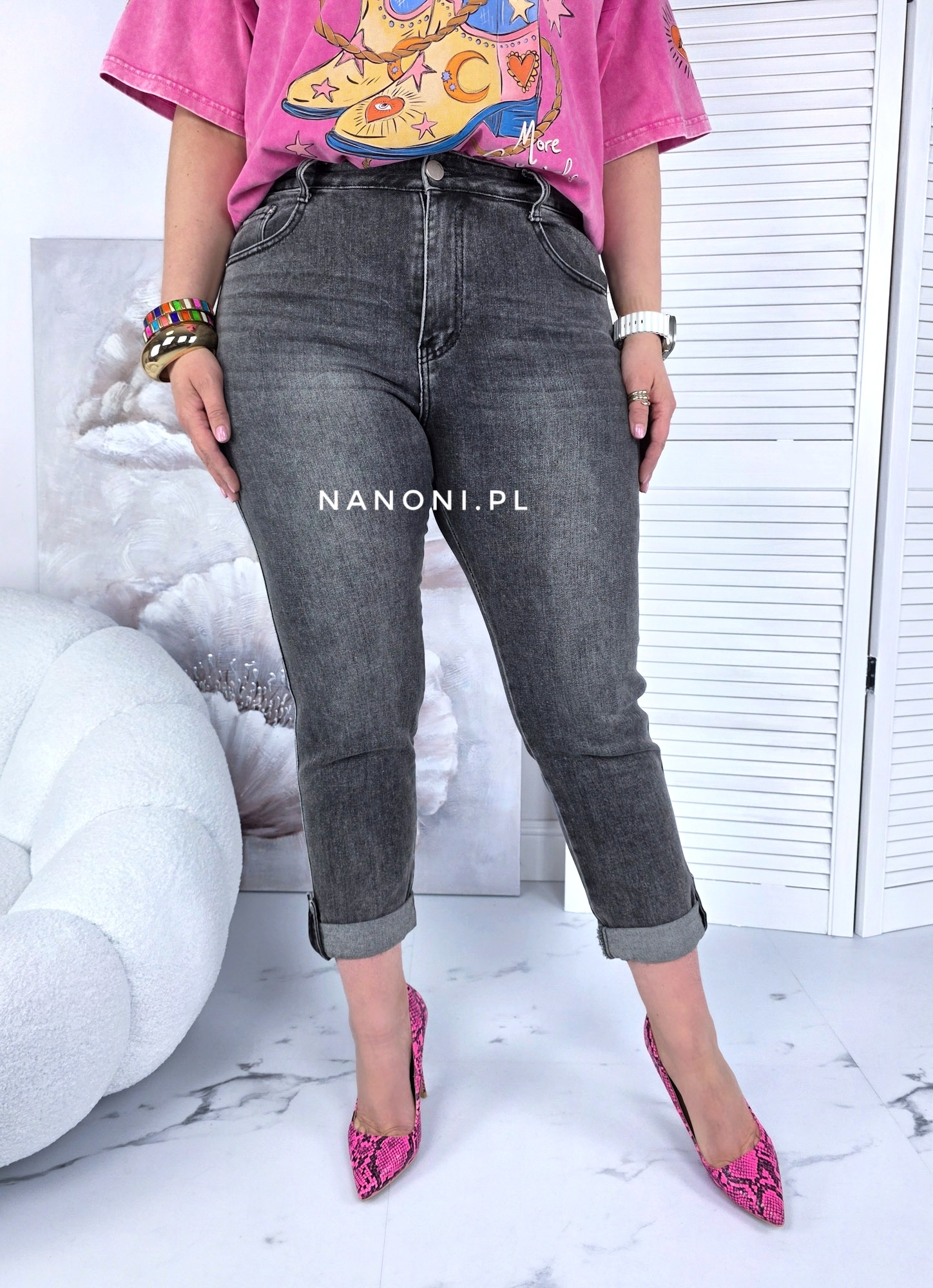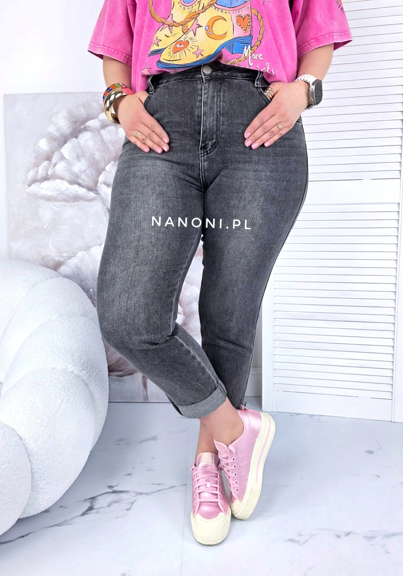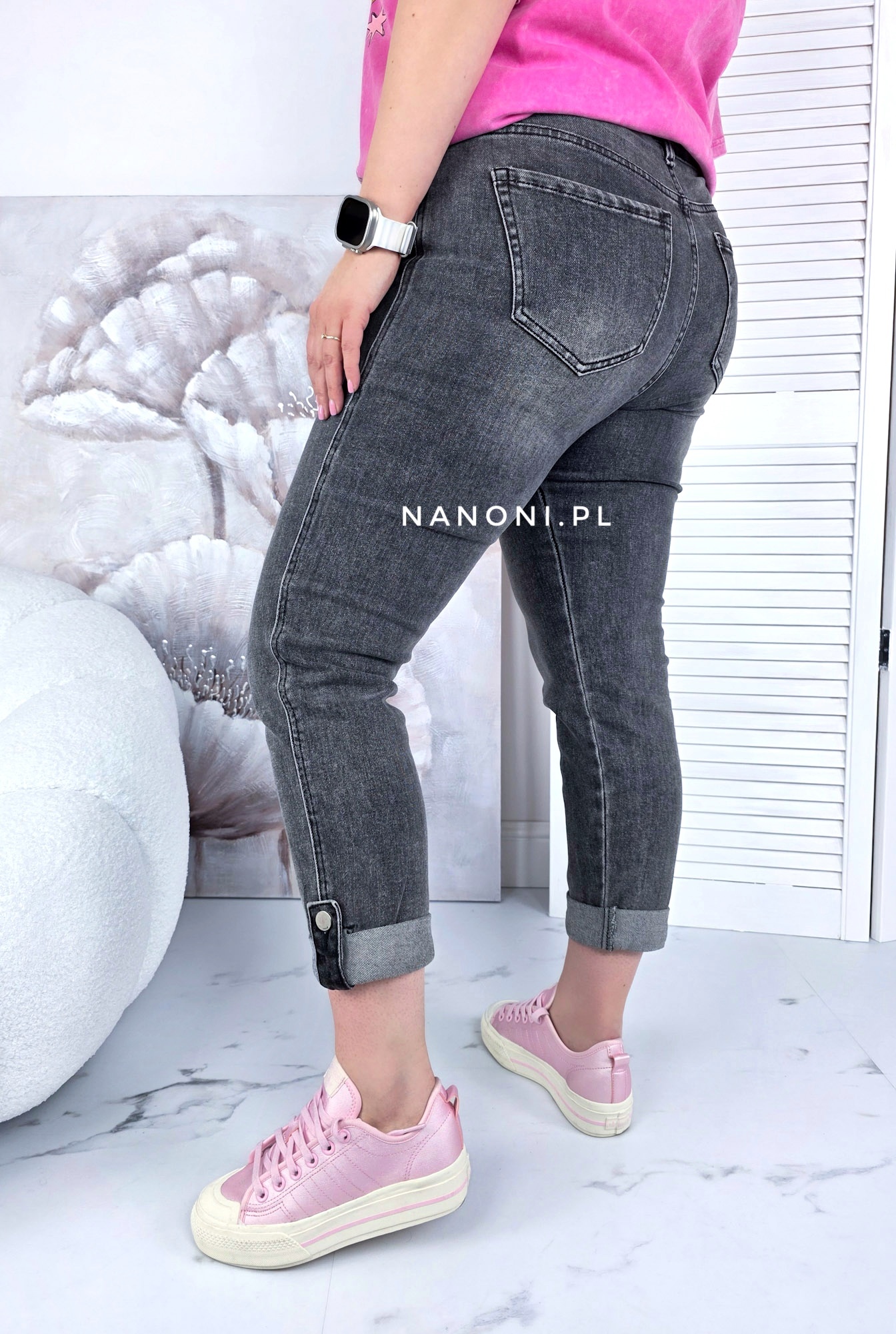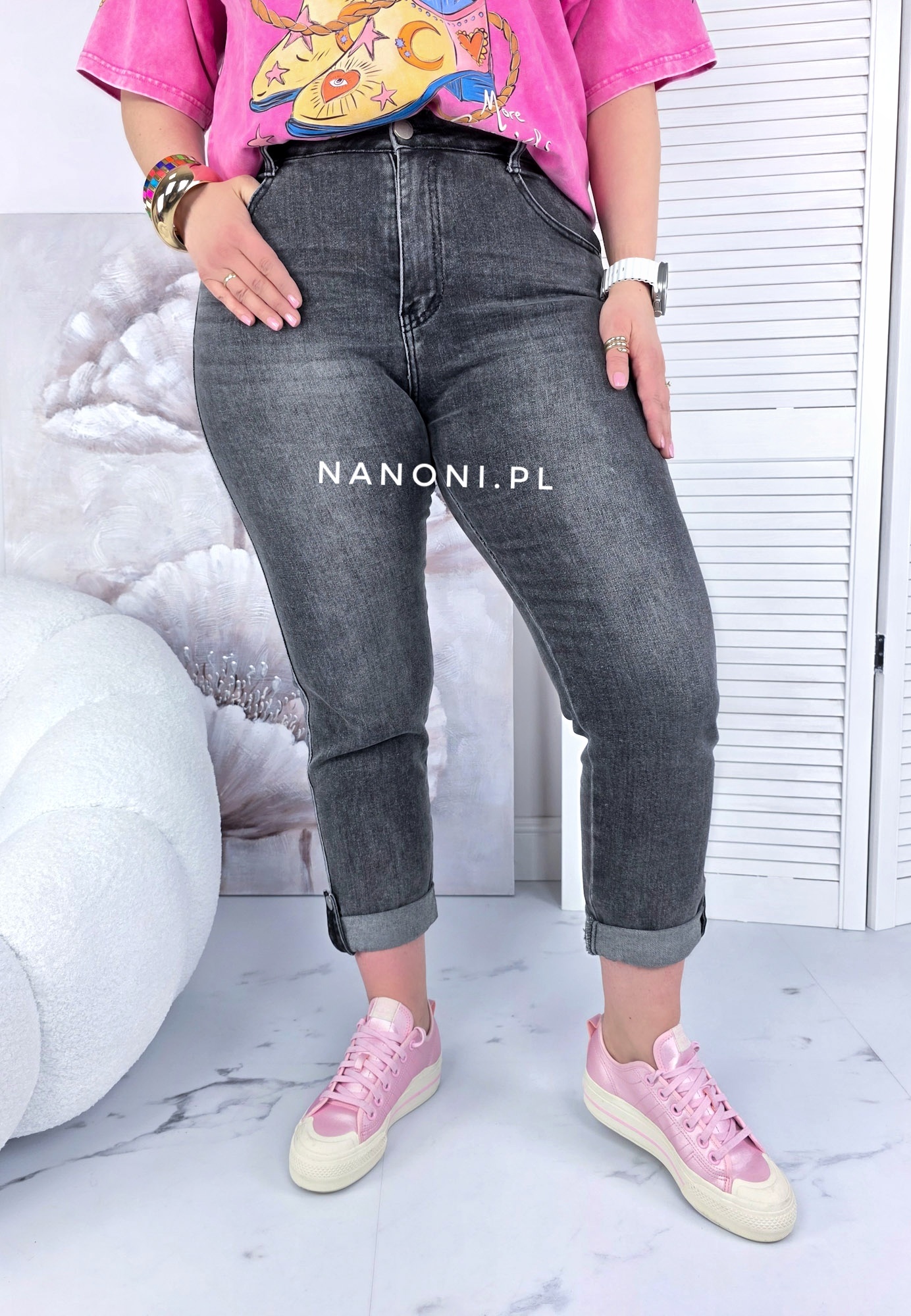 Spodnie jeansy plus size model mom fit, w kolorze szarym, który charakteryzuje się wysokim stanem i szerszą nogawką w biodrach, która nieco zwęża się ku dołowi. Nogawka jest podwinięta i na końcu zapinana na guzik.