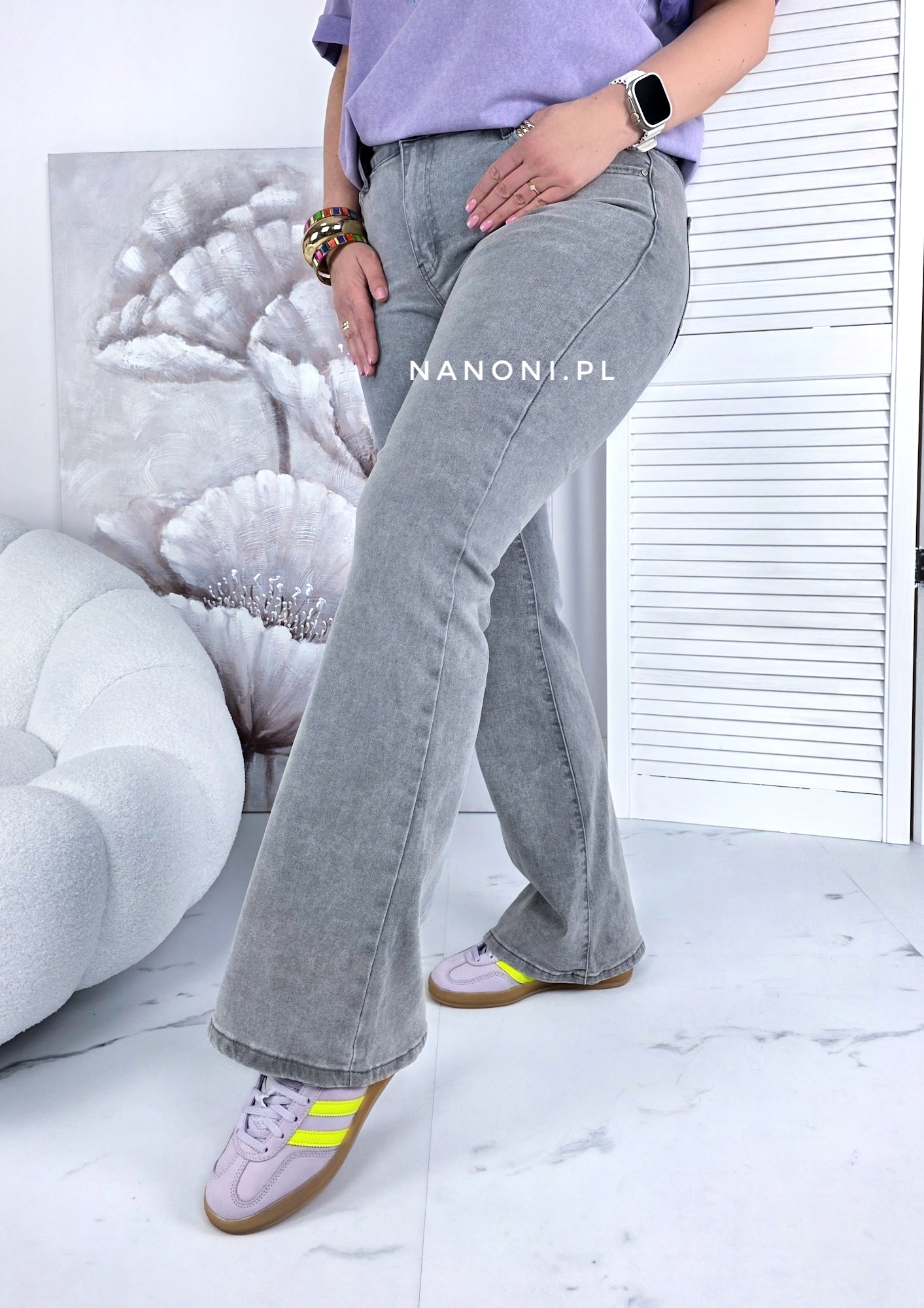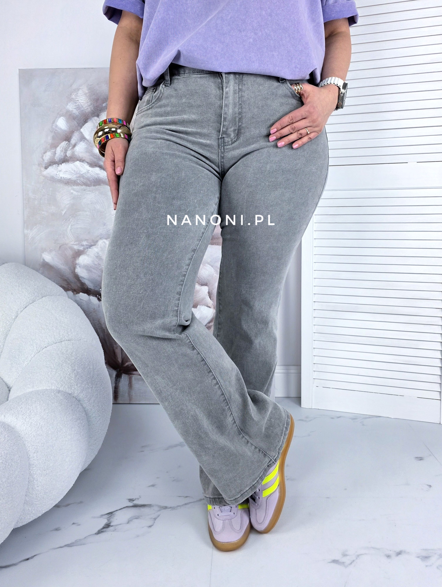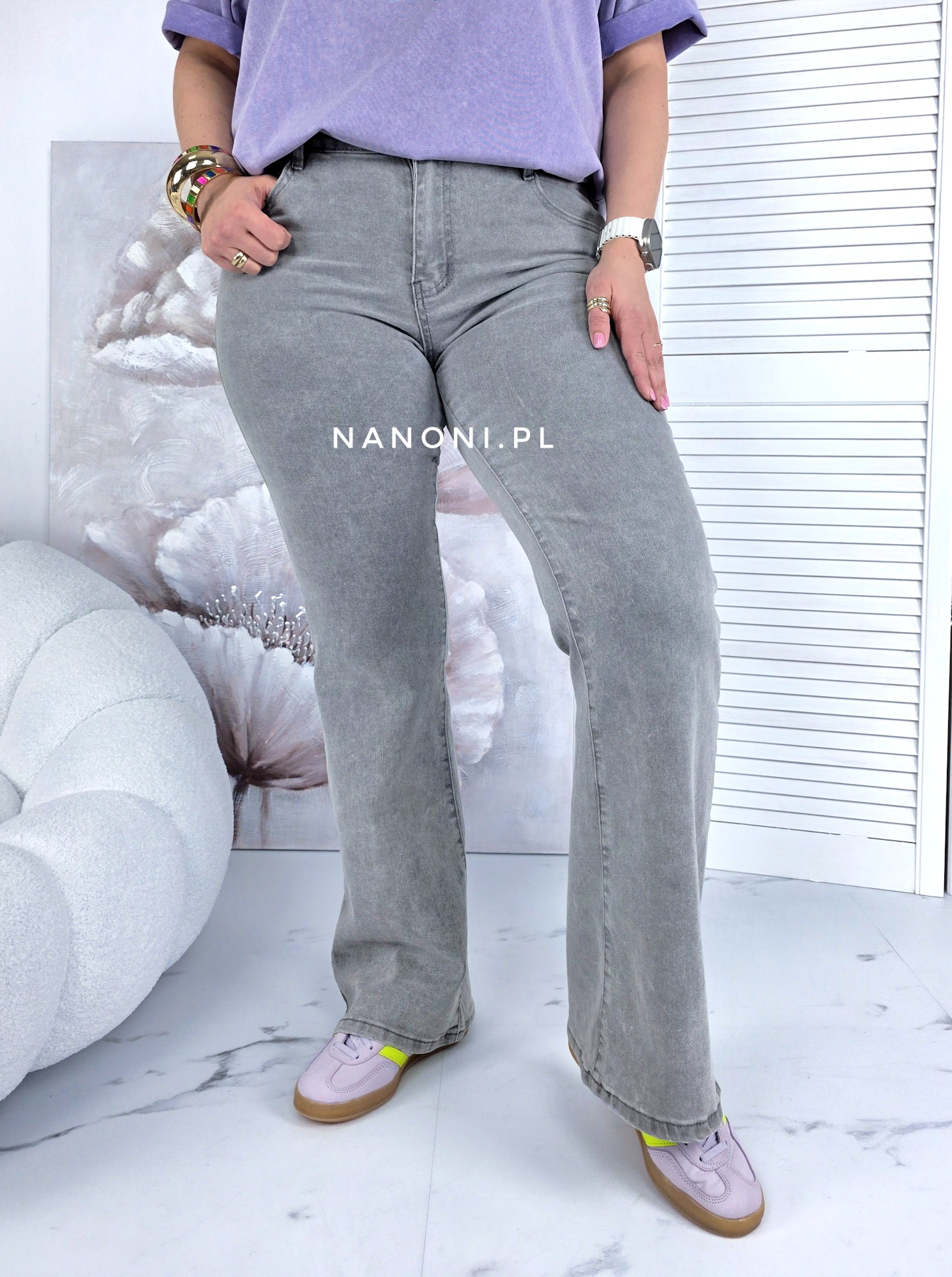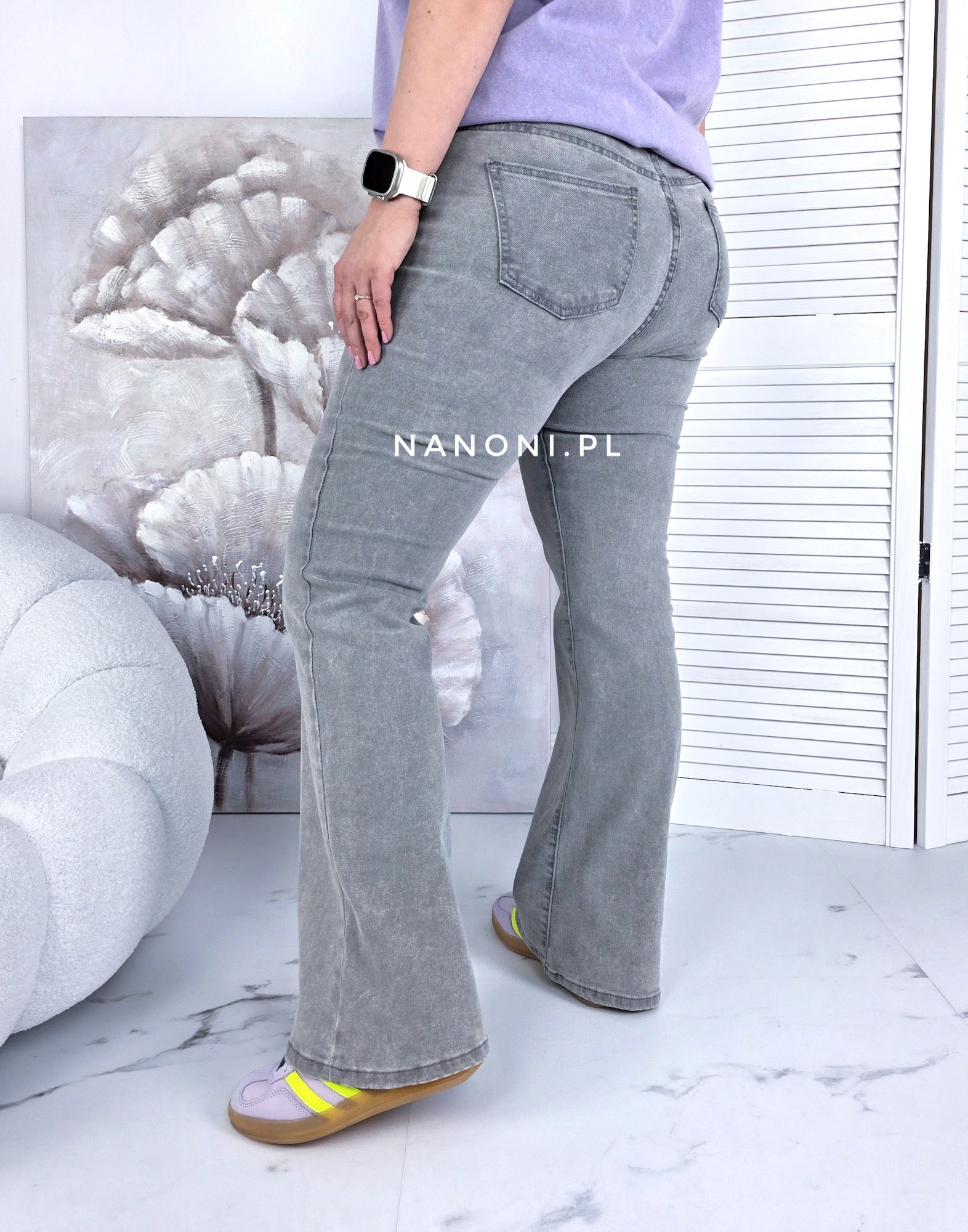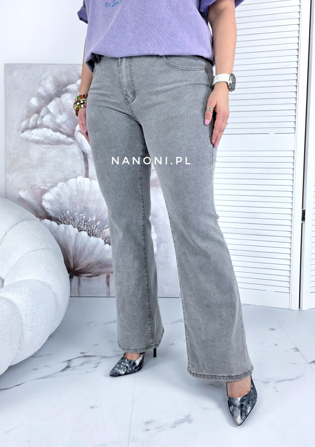 Spodnie Jeansowe typu dzwony plus size szare, z wyższym stanem.