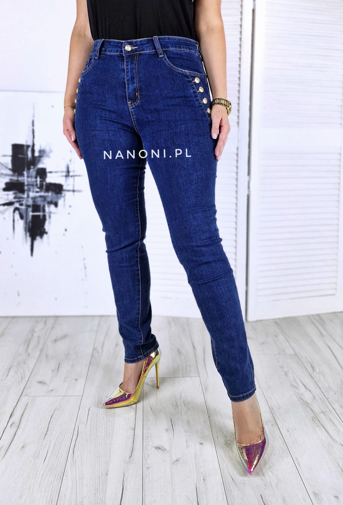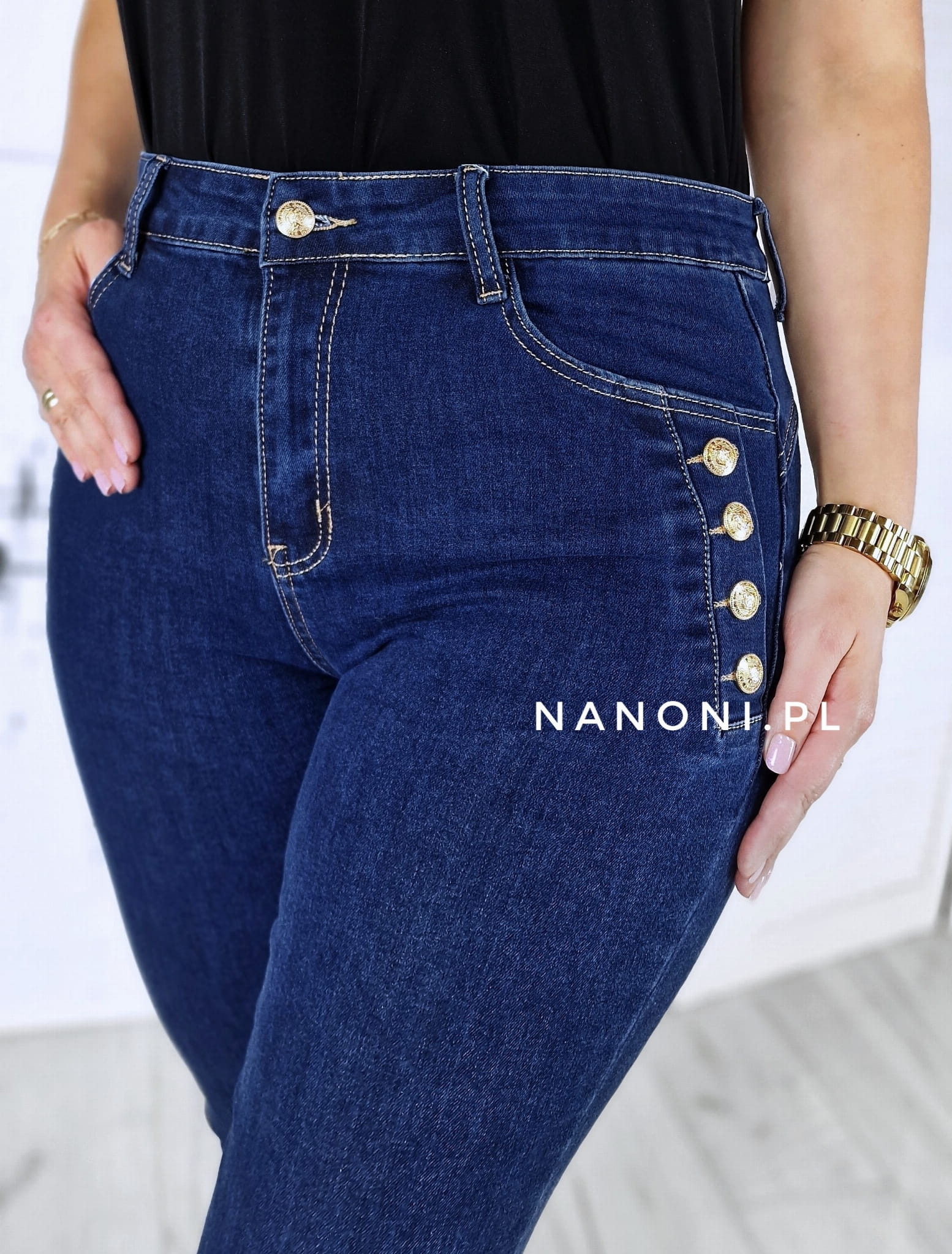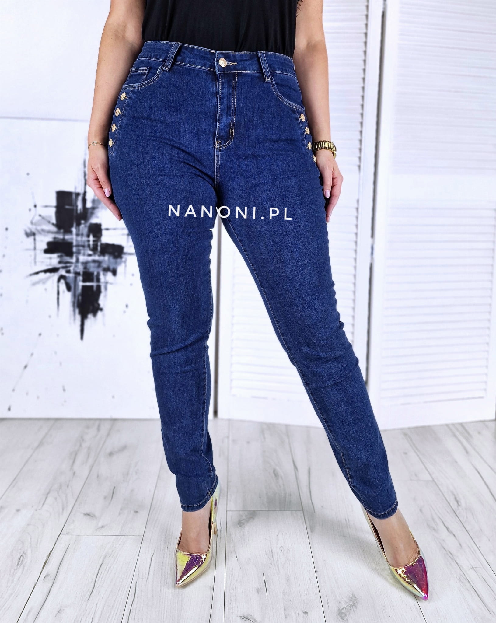 Spodnie jeansowe granatowe plus size, po bokach ozdobione guzikami w kolorze złotym, z wyższym stanem.