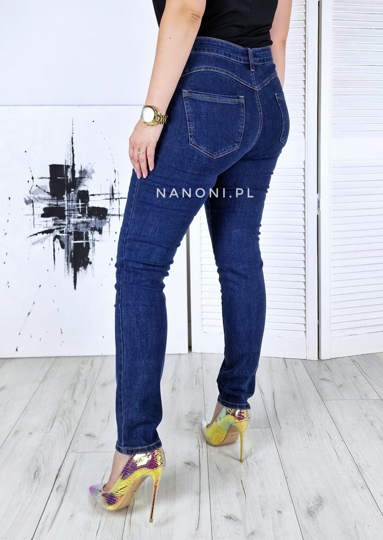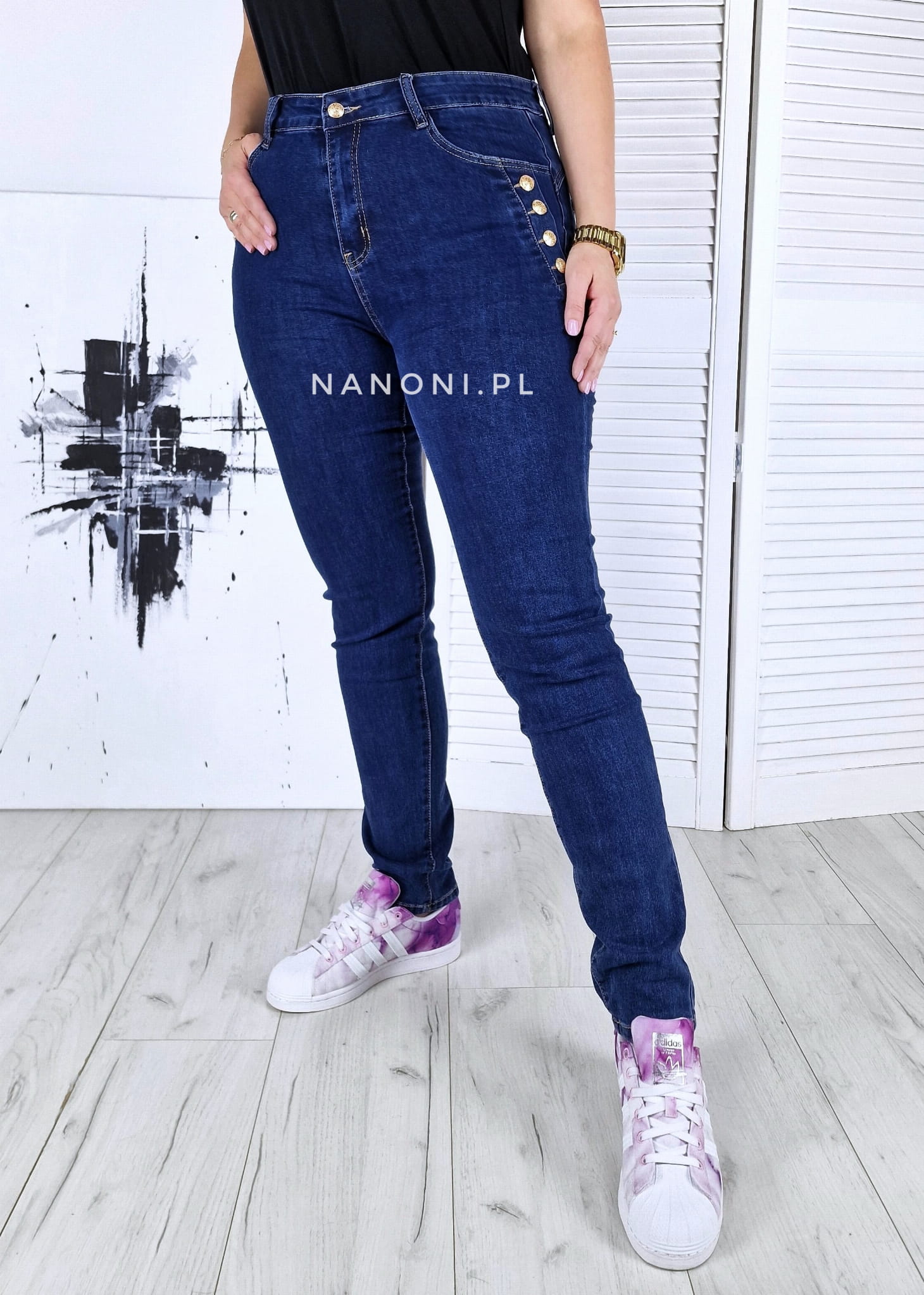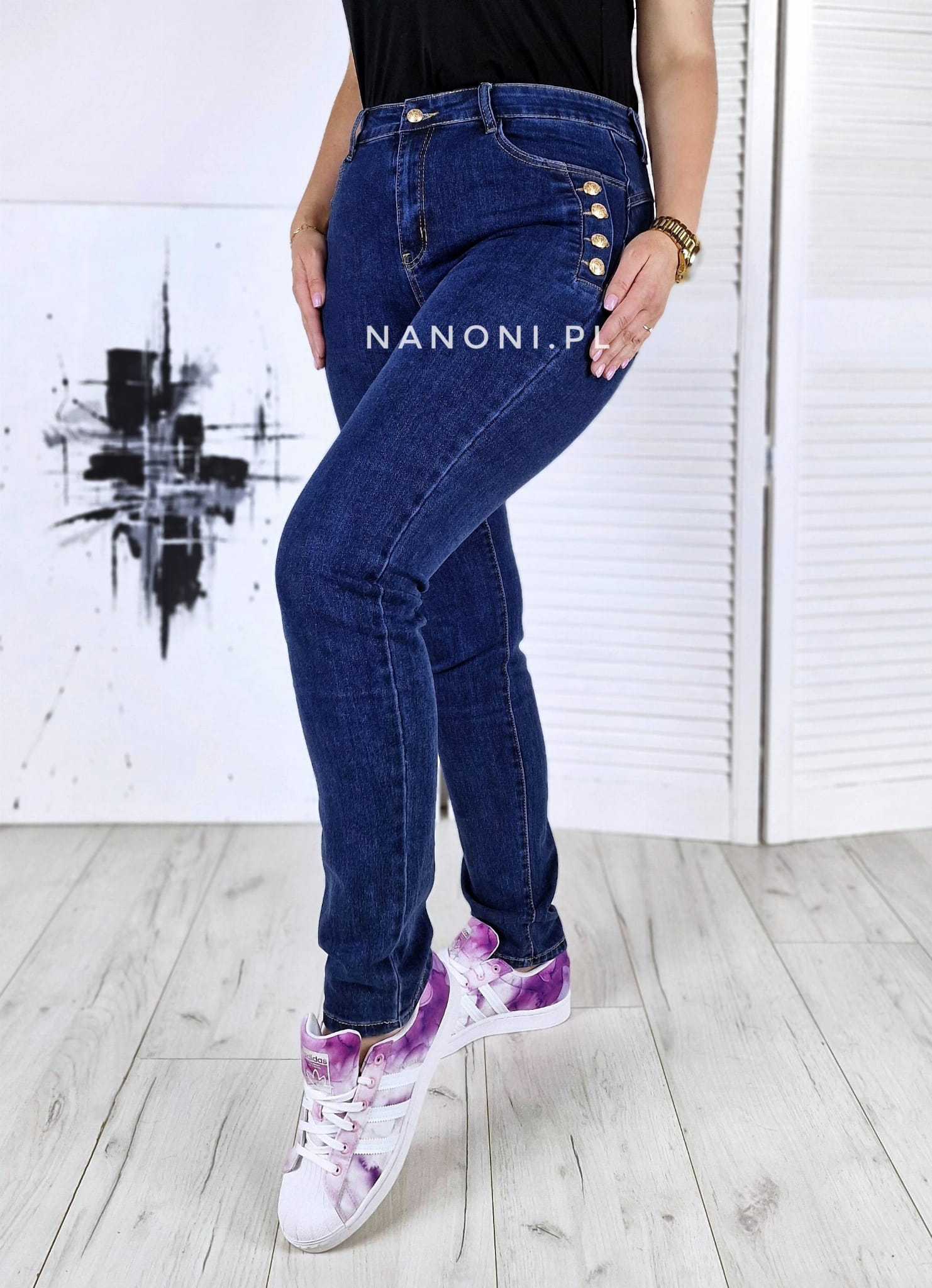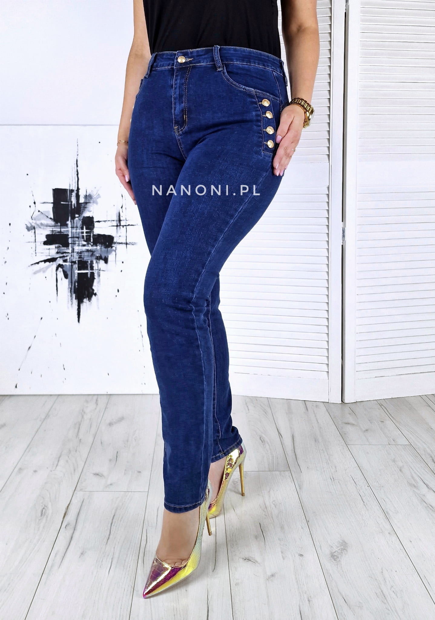 Spodnie jeansowe granatowe plus size, po bokach ozdobione guzikami w kolorze złotym, z wyższym stanem.