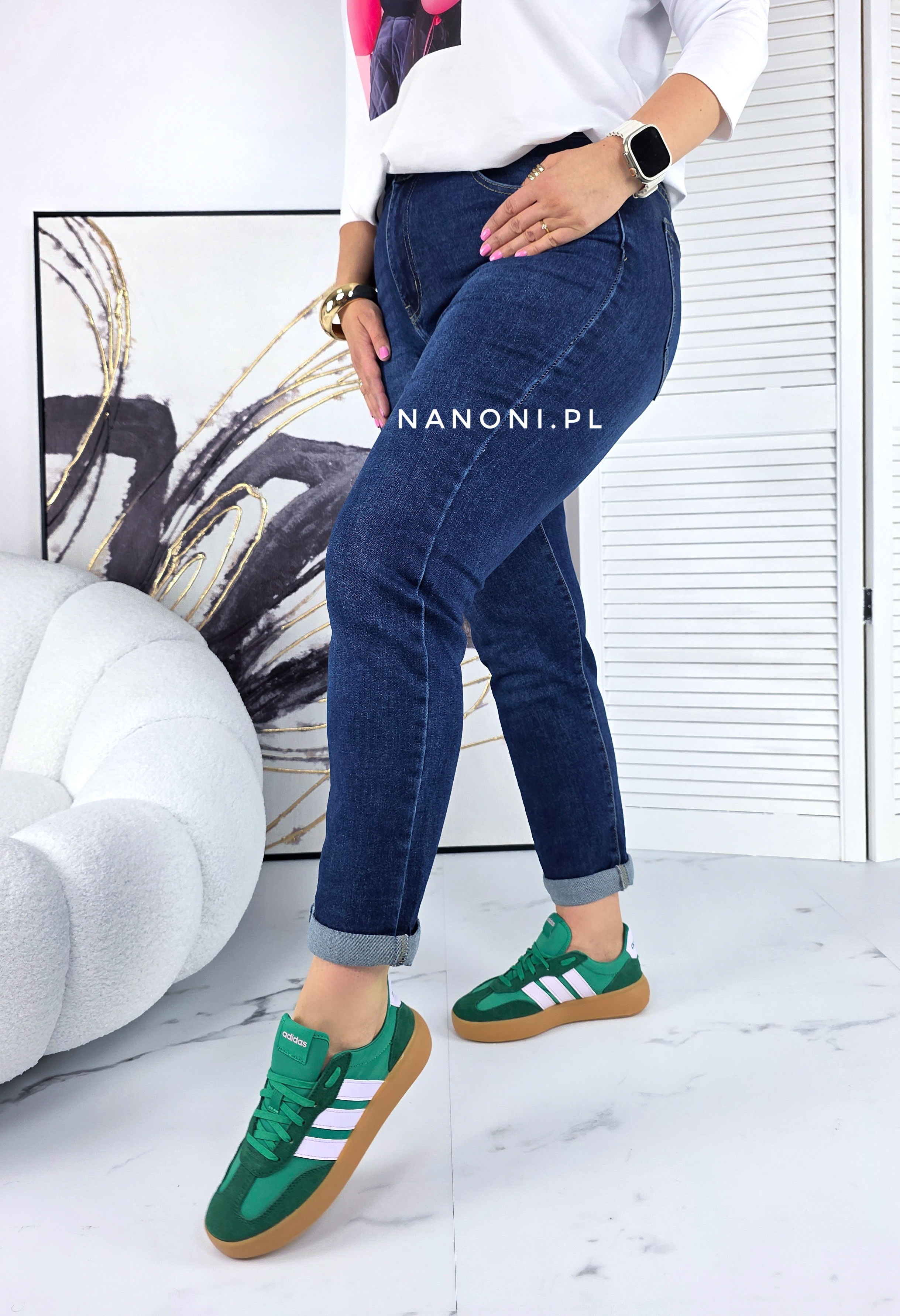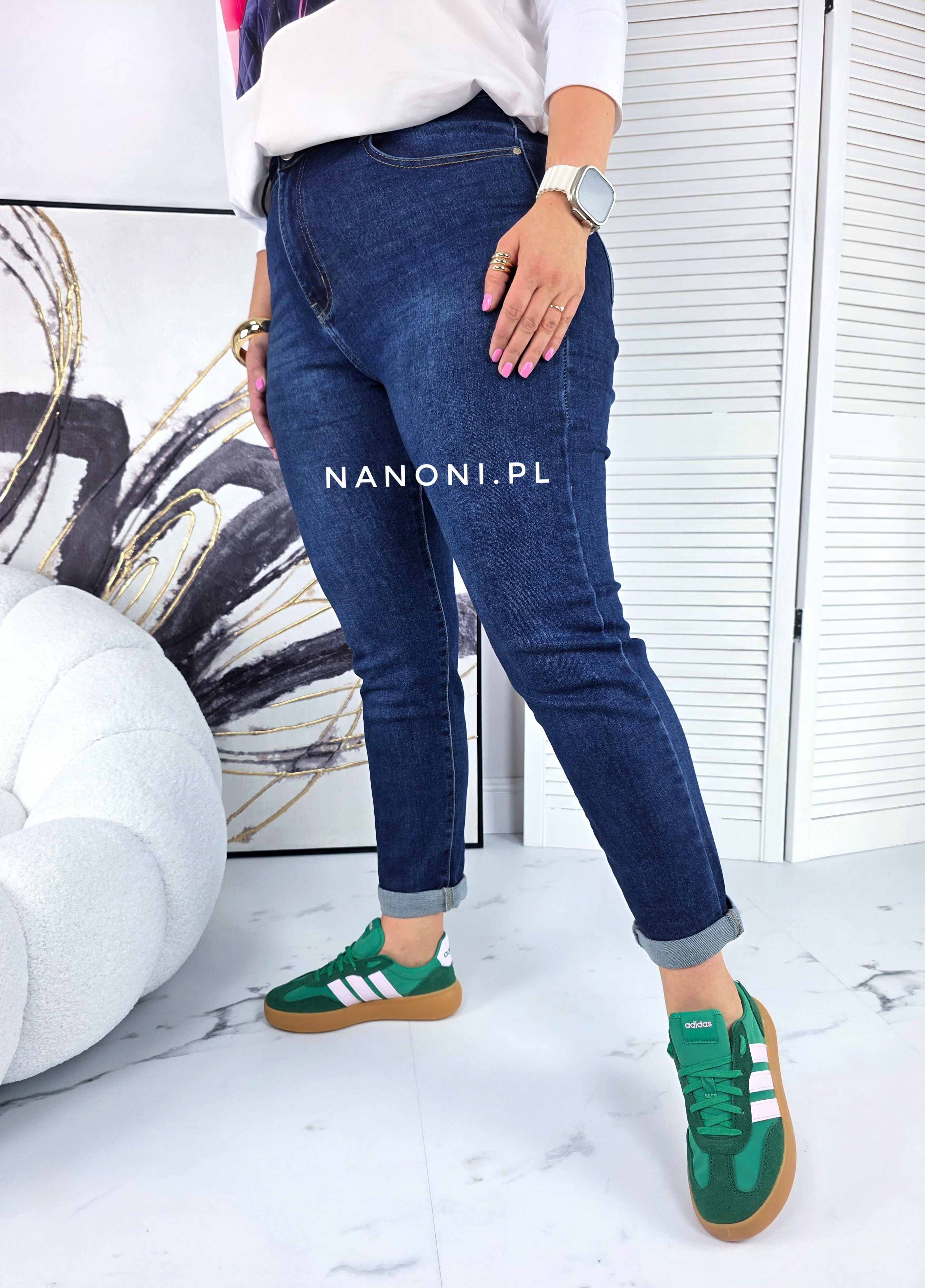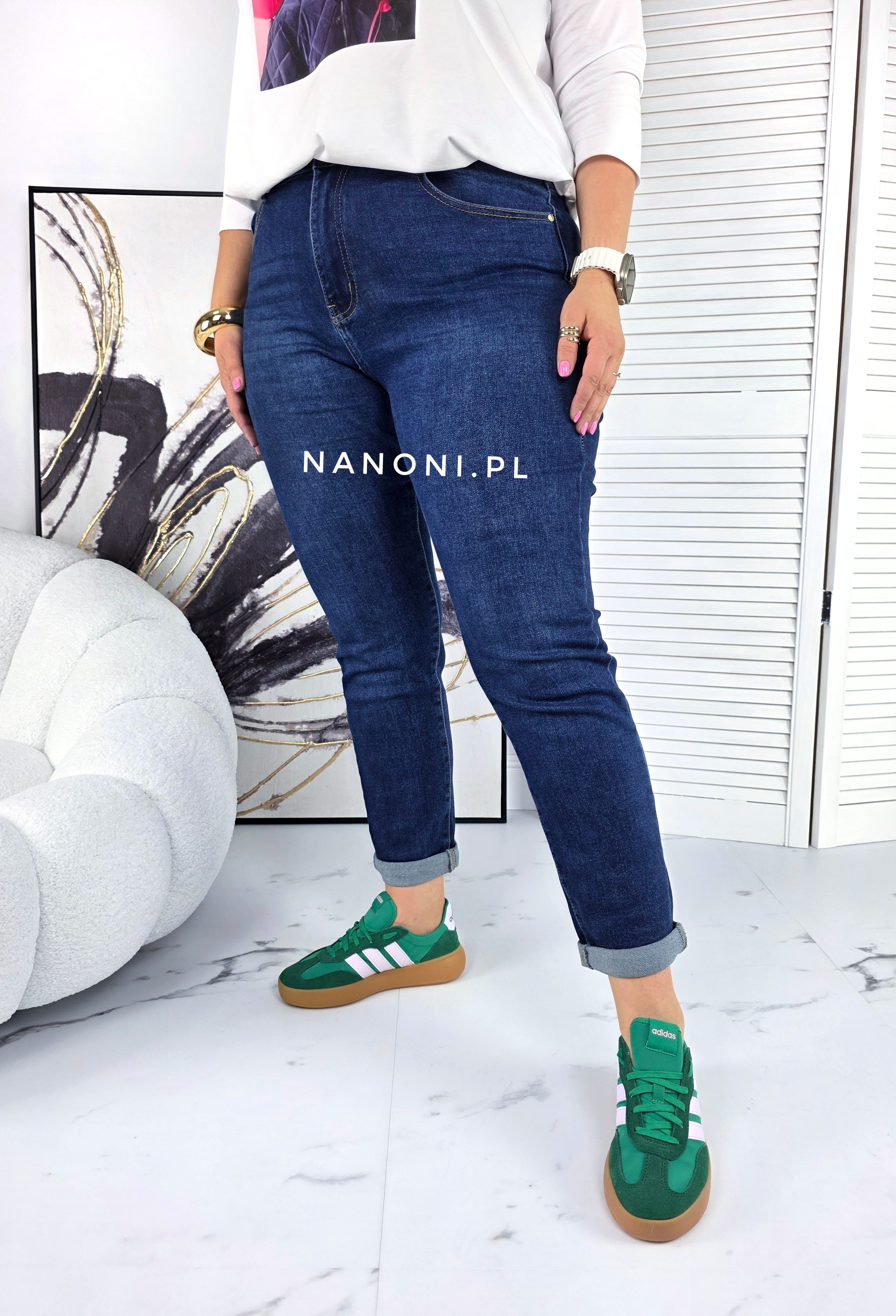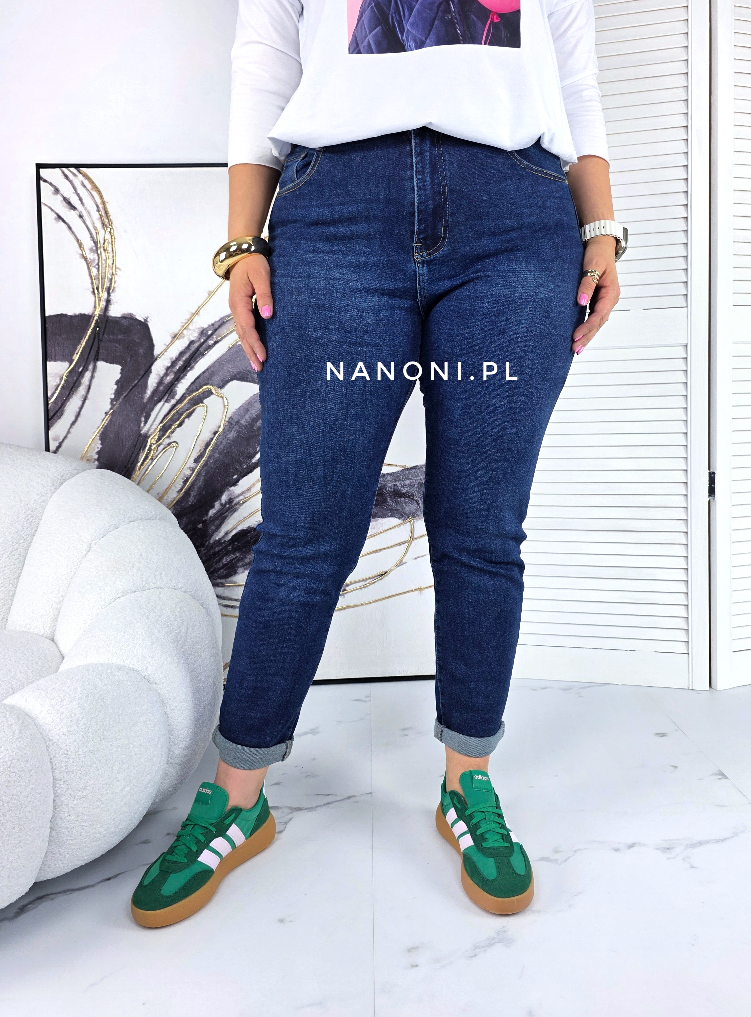 Spodnie jeansy niebieskie plus size model mom fit, z wyższym stanem, który charakteryzuje się wysokim stanem i szerszą, luźną nogawką w biodrach, która nieco zwęża się ku dołowi. Nogawka jest podwinięta.