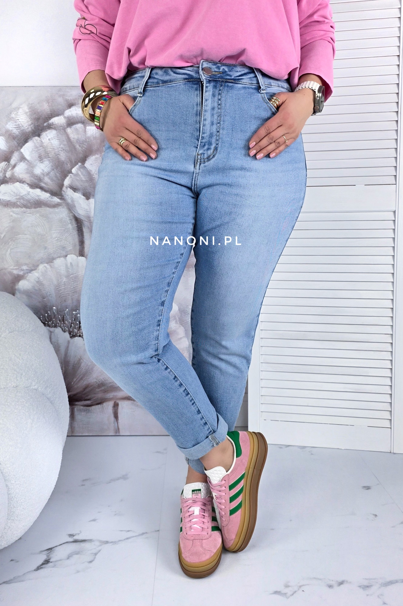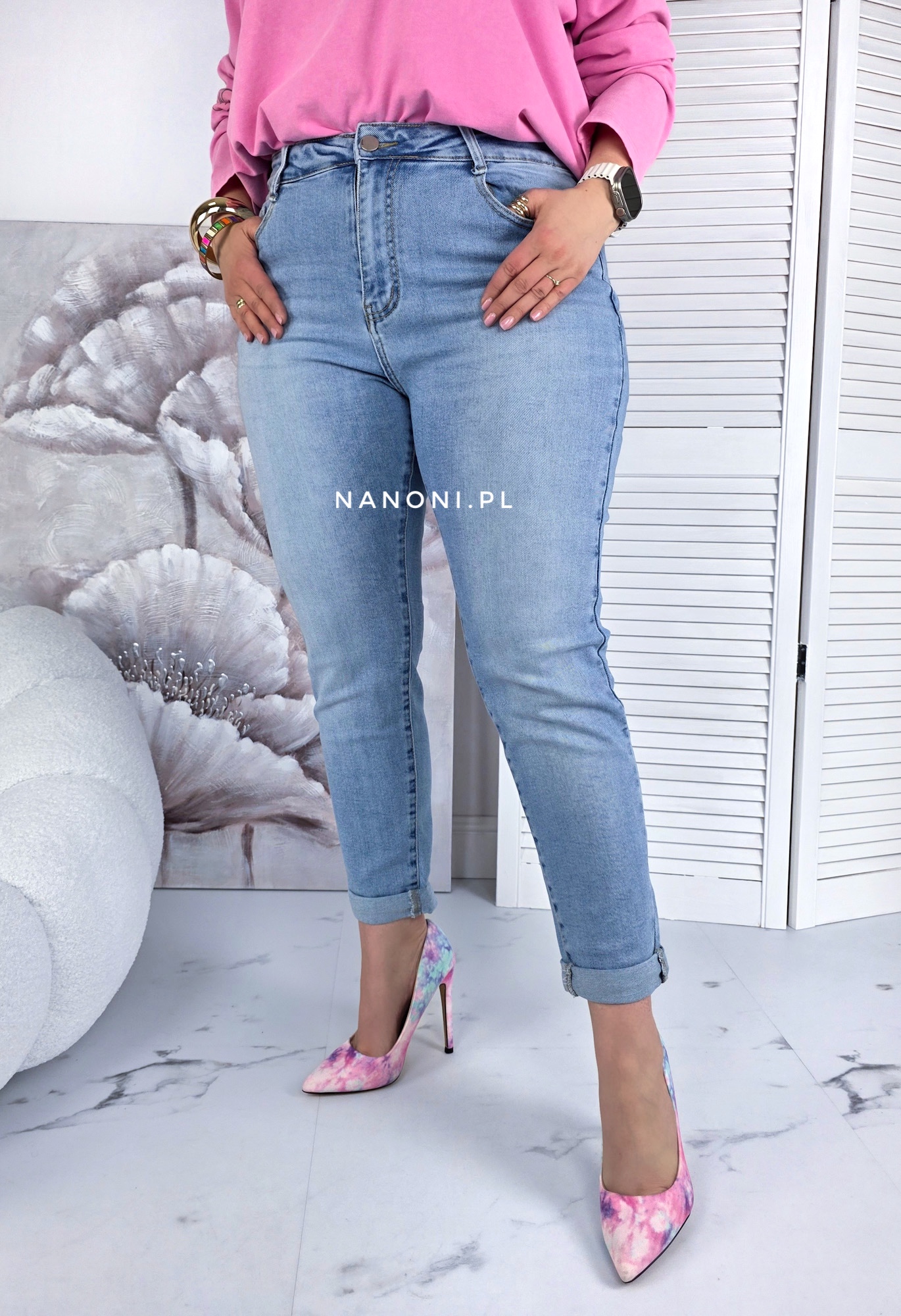 Spodnie jeansy niebieskie plus size model mom fit, z wyższym stanem. Nogawka jest podwinięta.