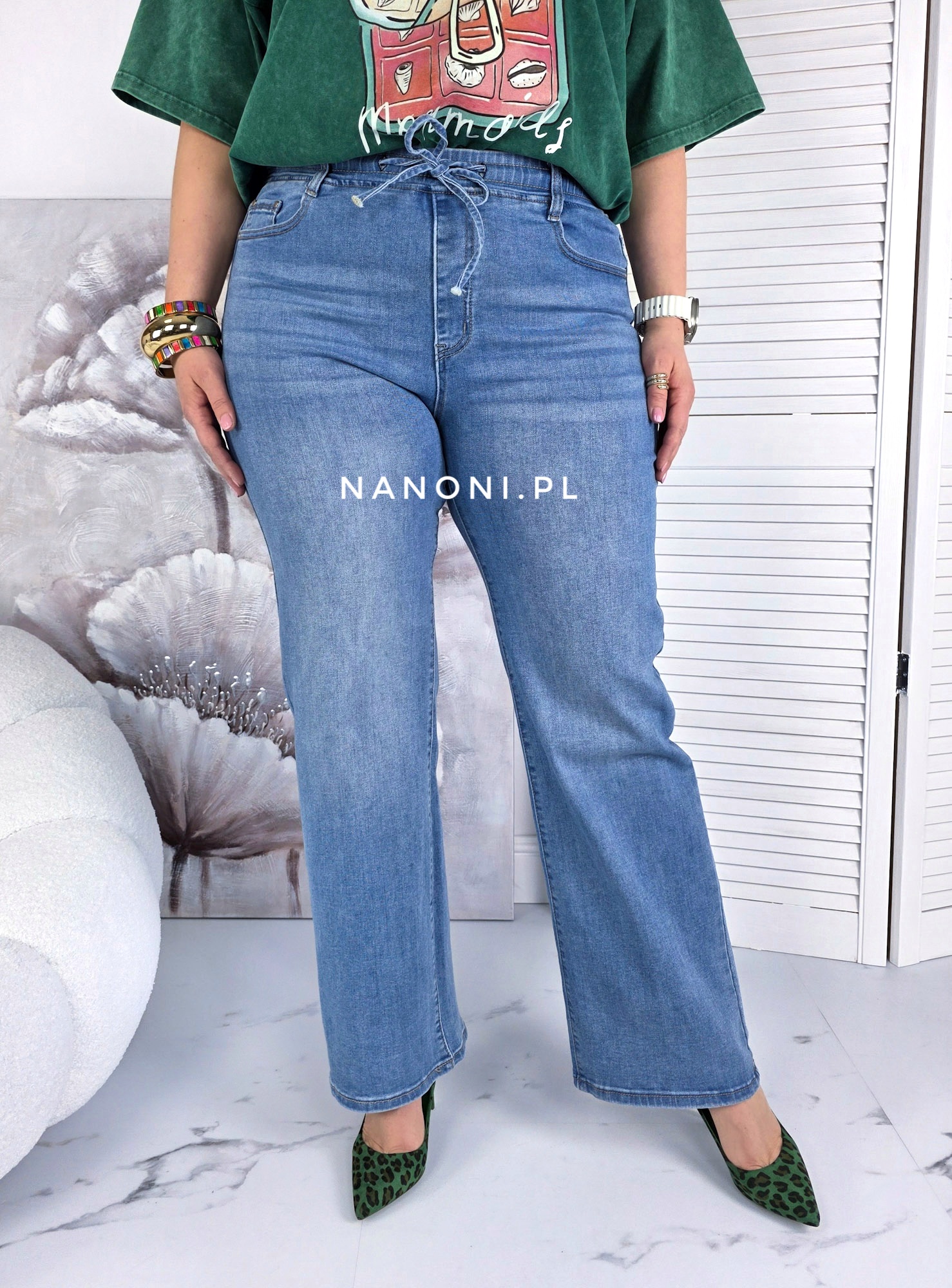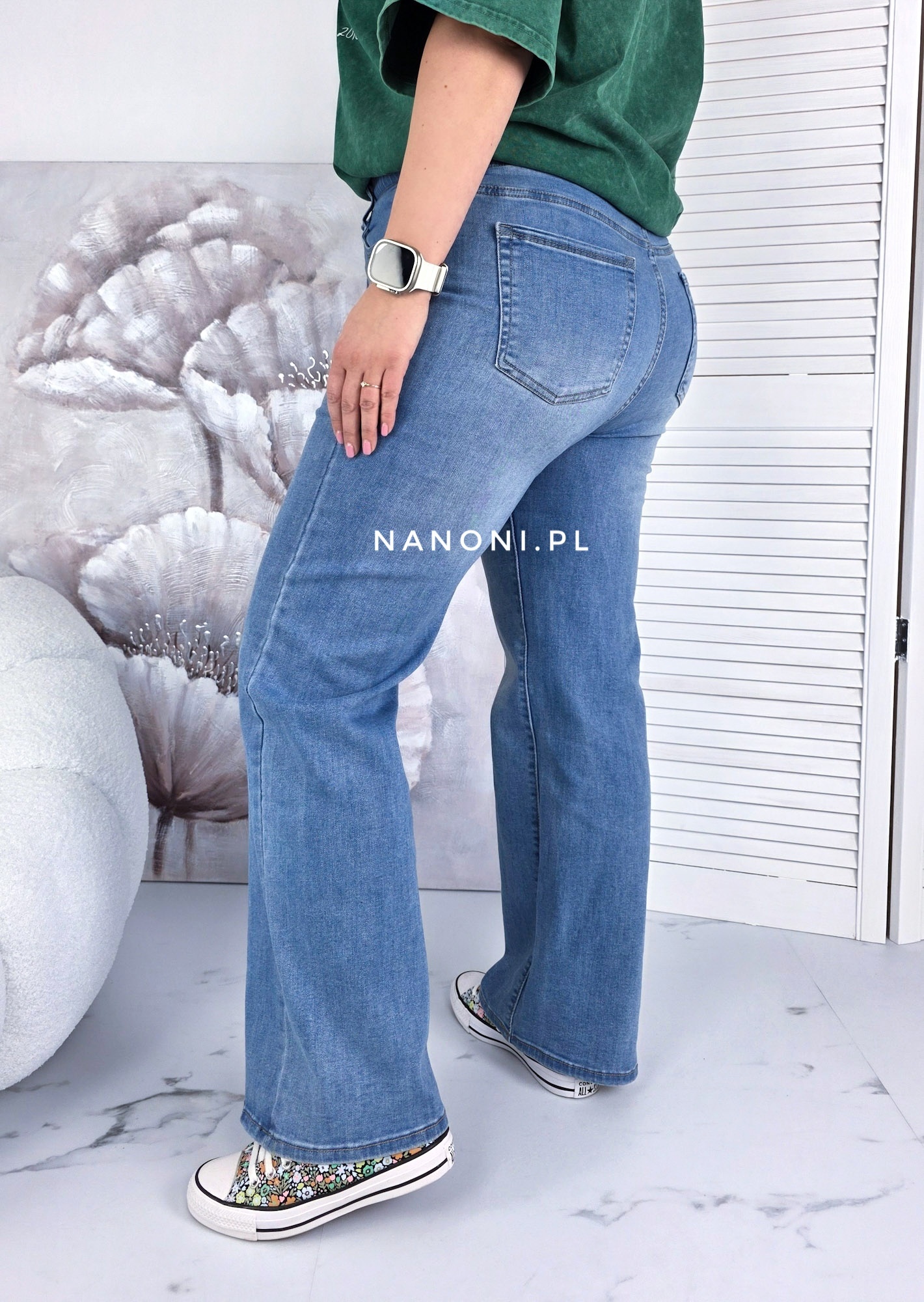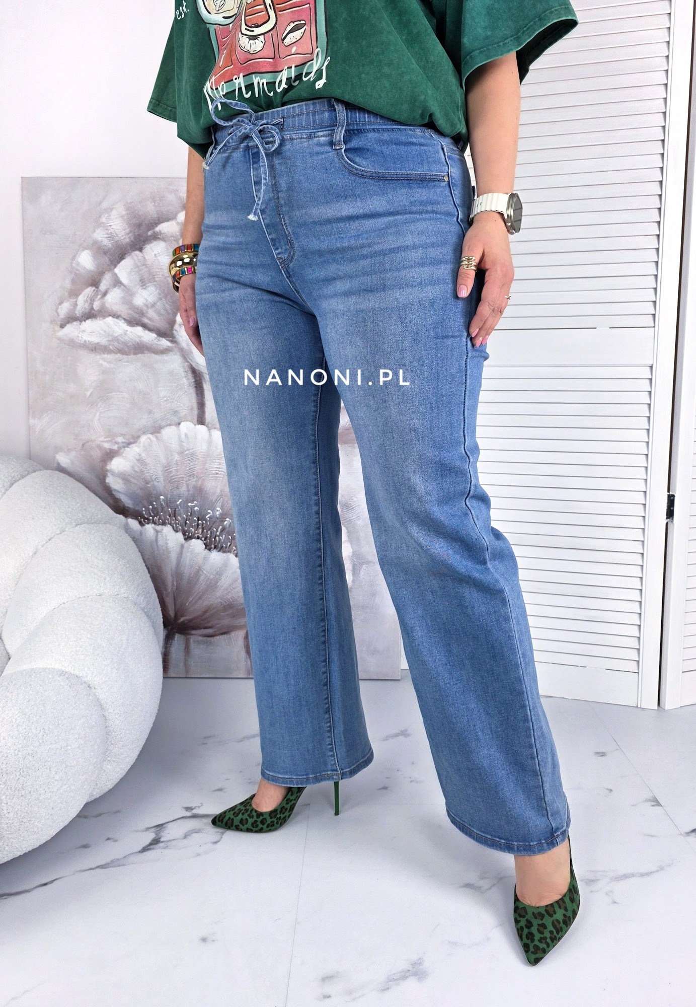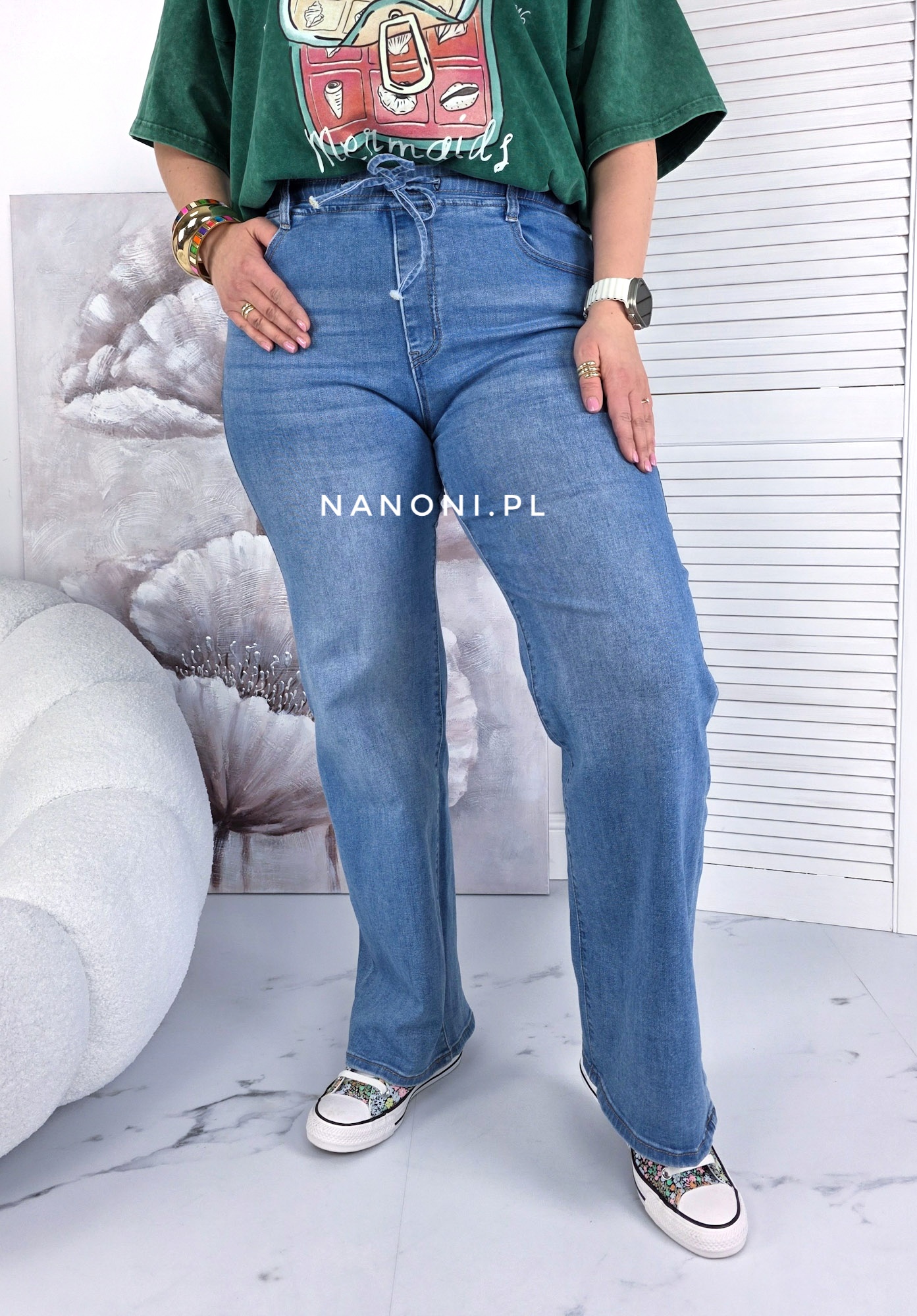 Spodnie jeansy proste plus size, z wyższym stanem, na gumie. Spodnie są w kolorze niebieskim.
