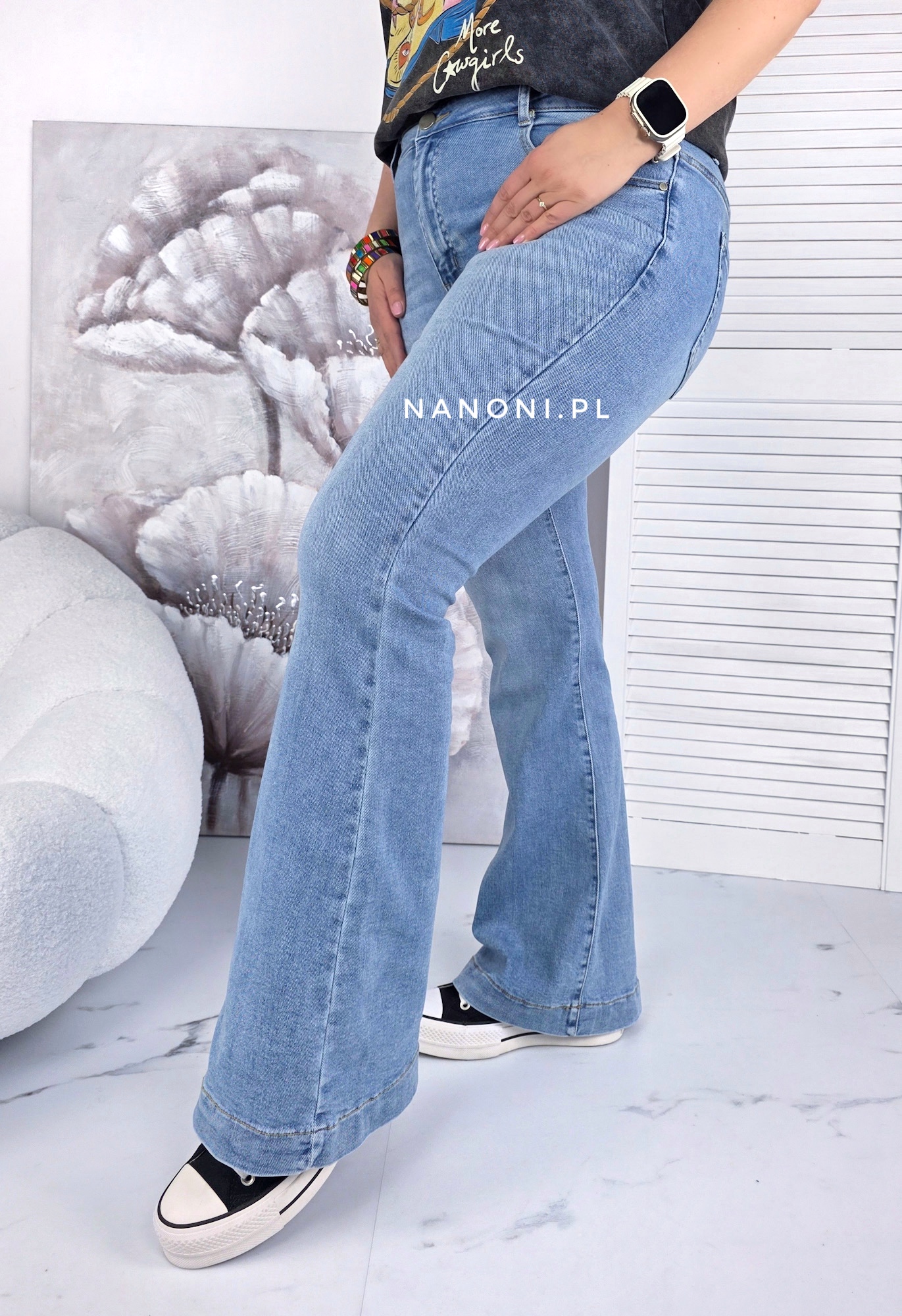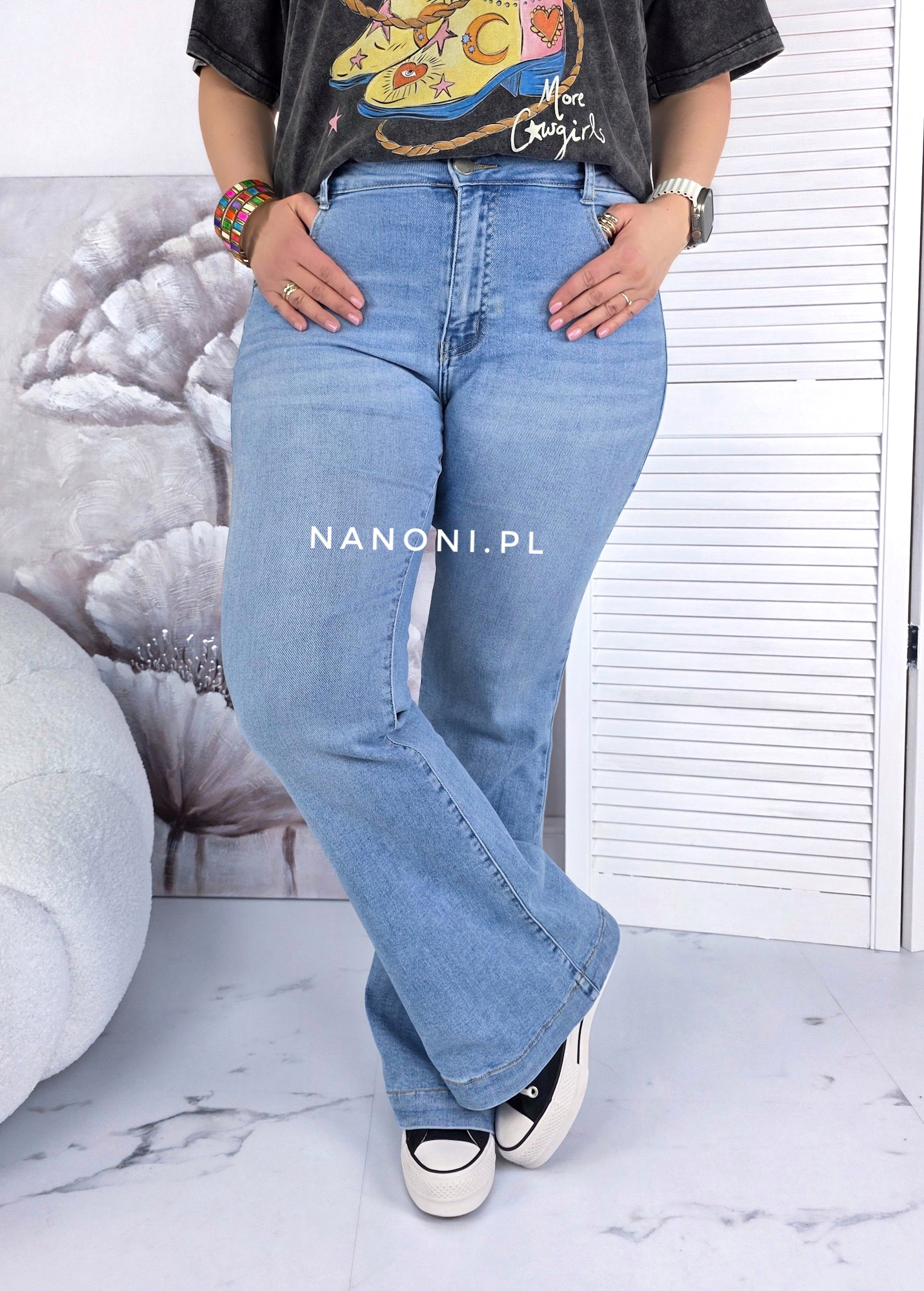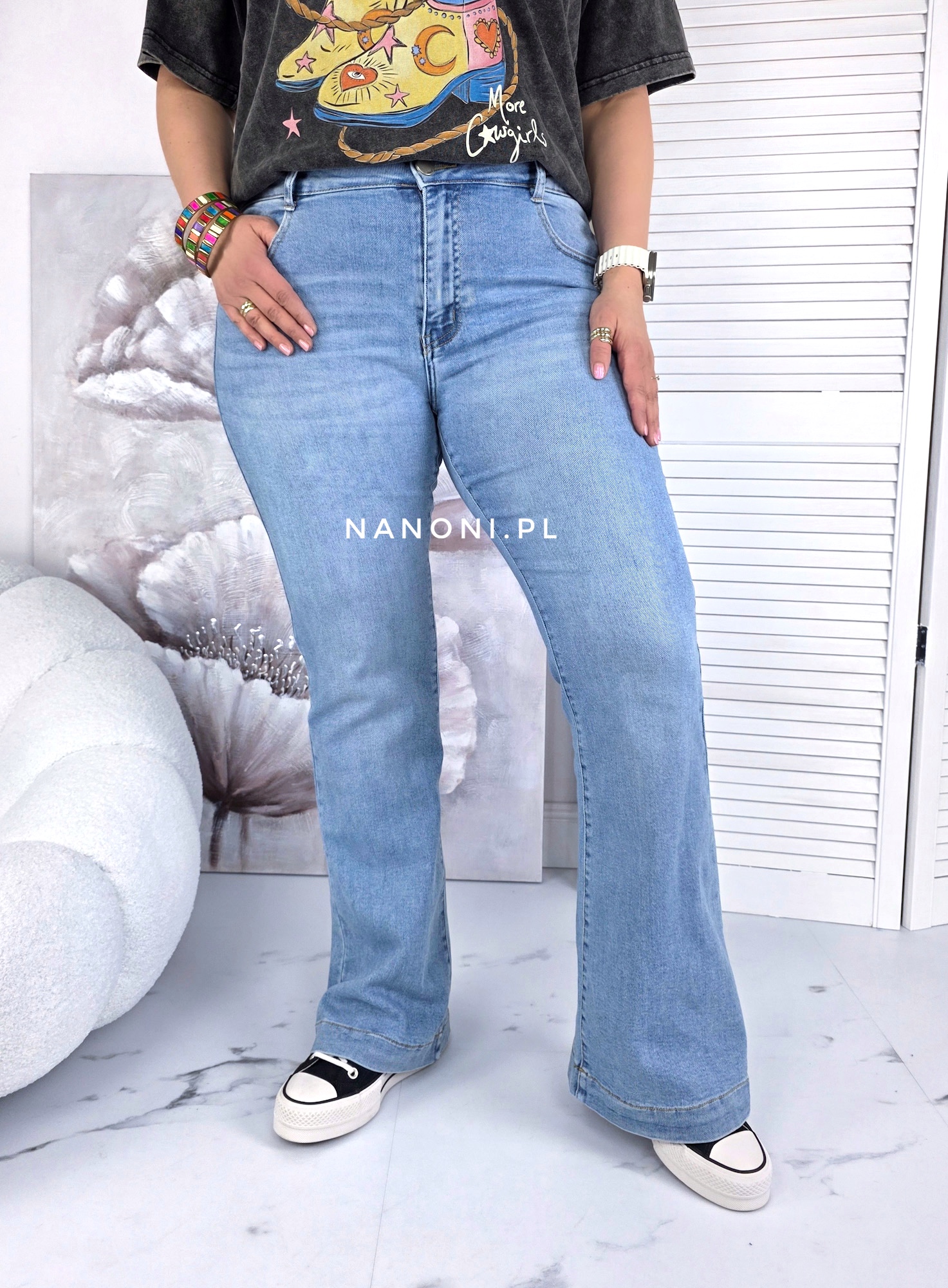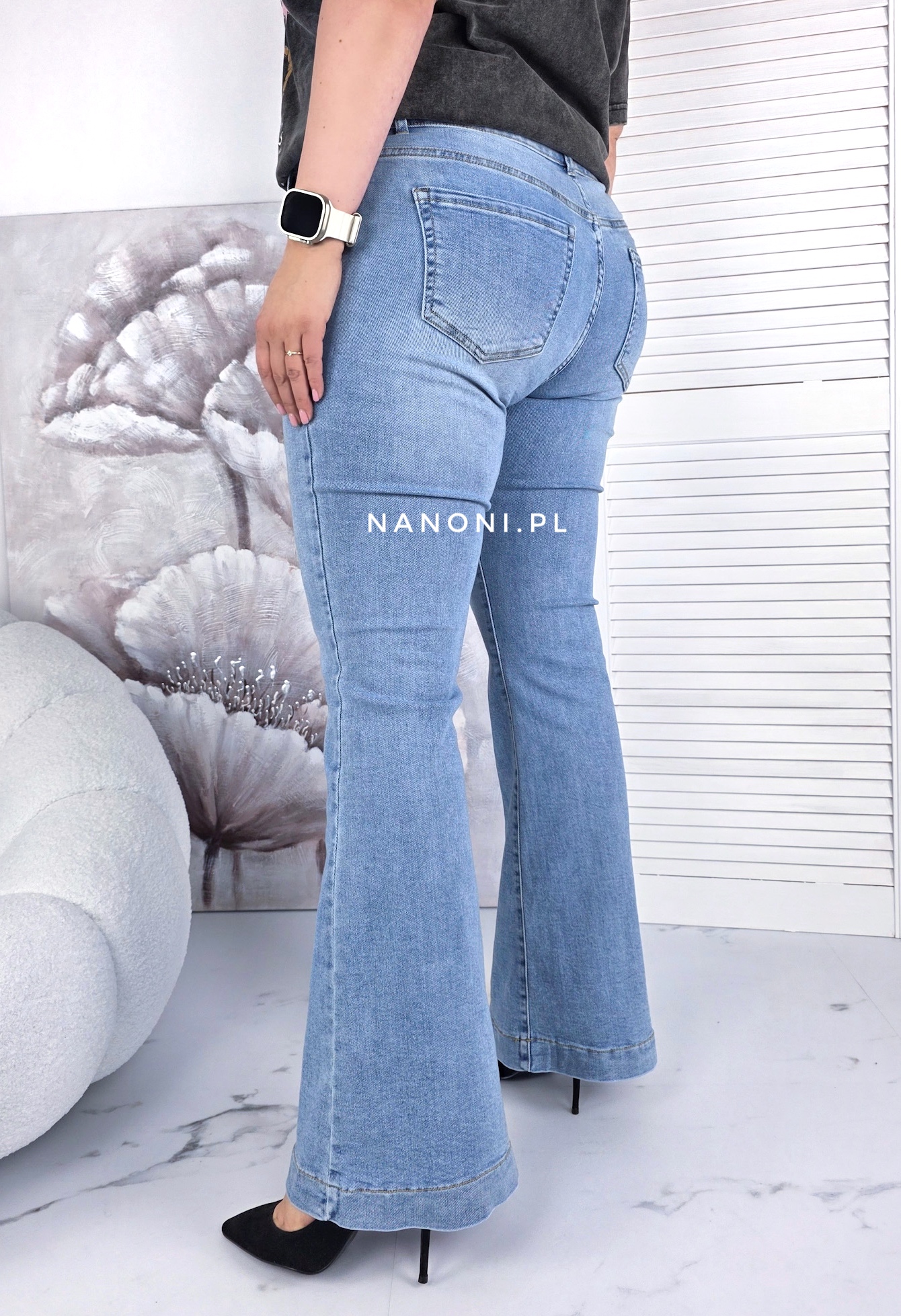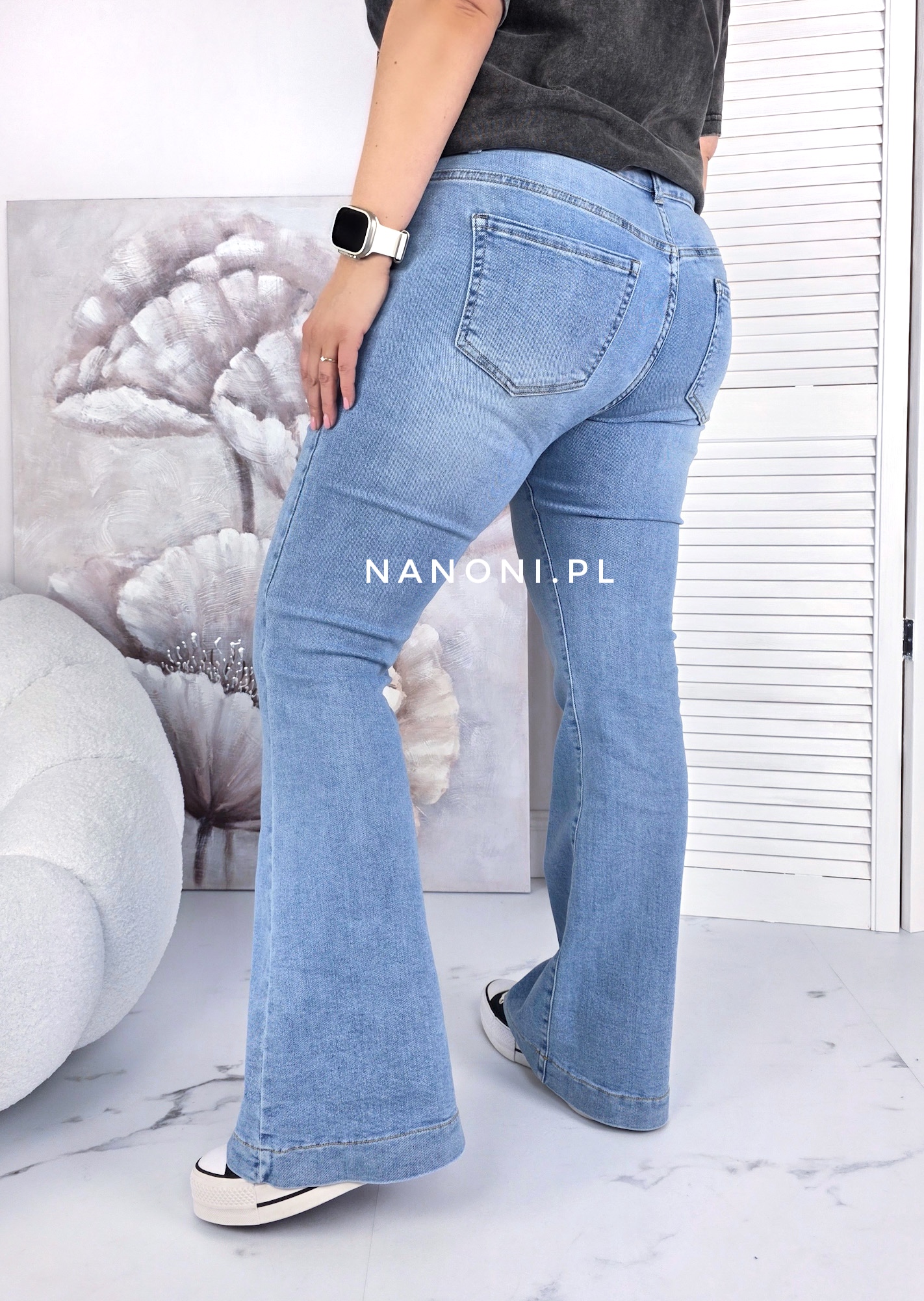 Spodnie jeansy dzwony niebieskie plus size model. Spodnie są z cieńszego jeansu.