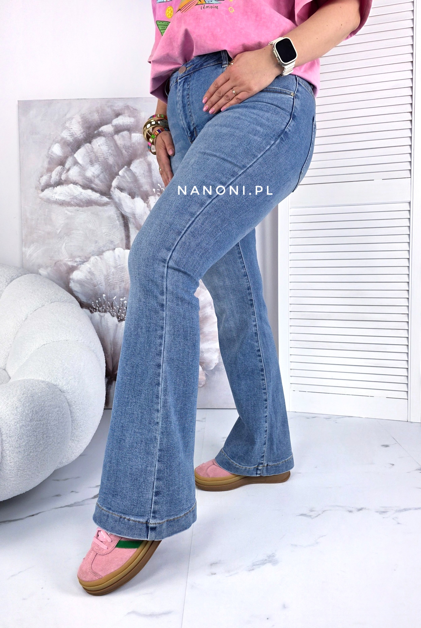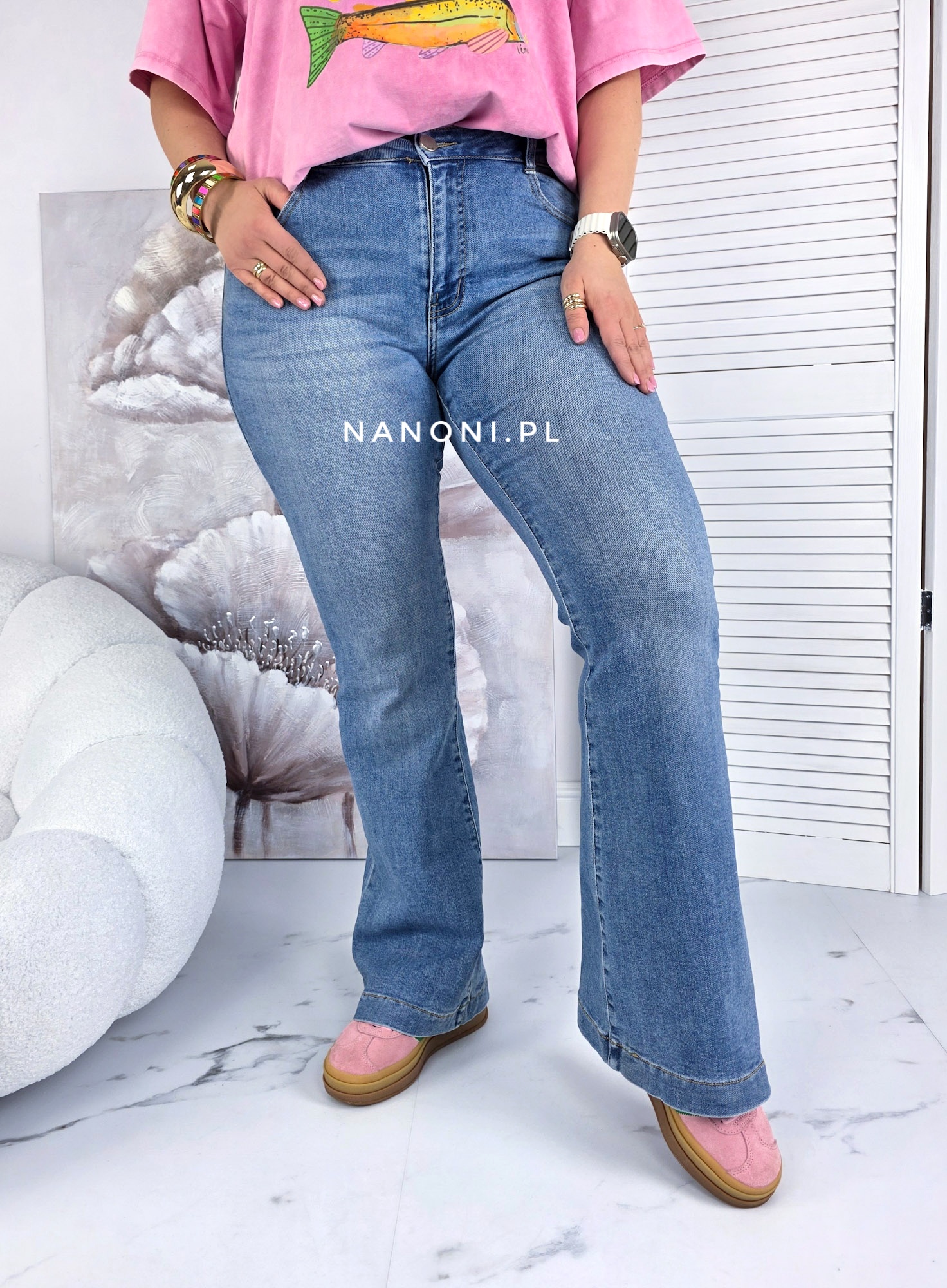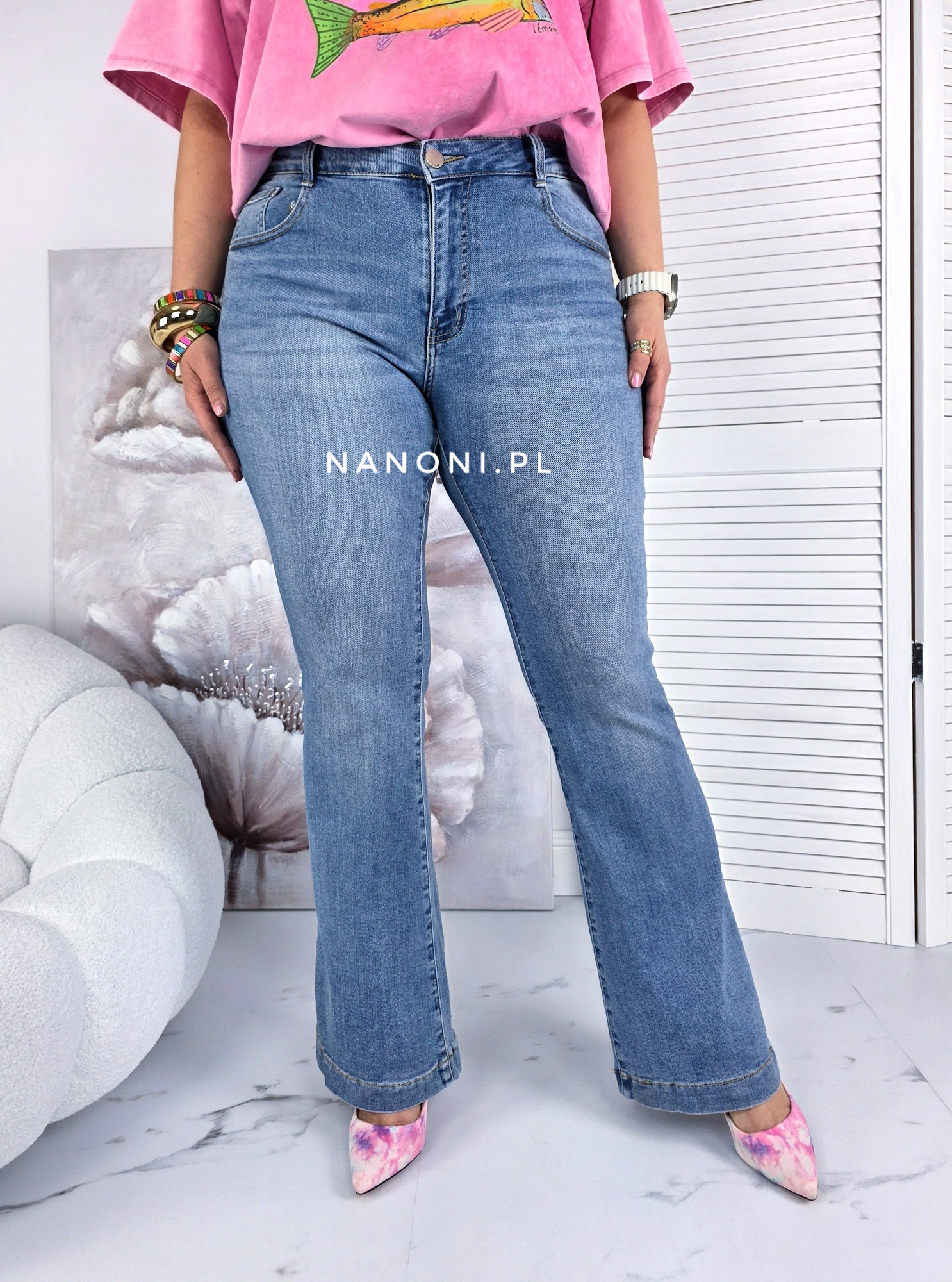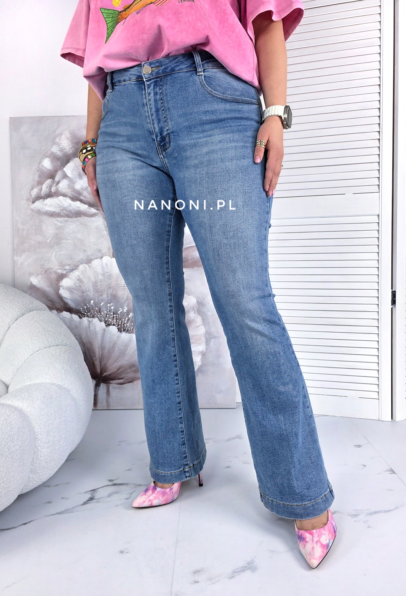 Spodnie jeansy dzwony niebieskie plus size model. Spodnie są z cieńszego jeansu.