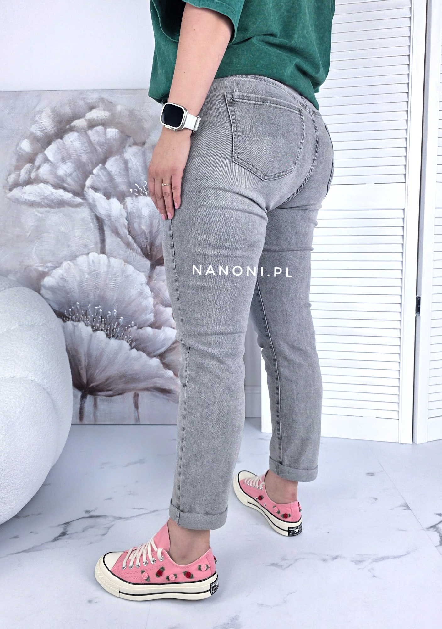 Spodnie jeansy szare jasne plus size model mom fit, który charakteryzuje się wysokim stanem i szerszą, luźną nogawką w biodrach, która nieco zwęża się ku dołowi. Nogawka jest podwinięta.