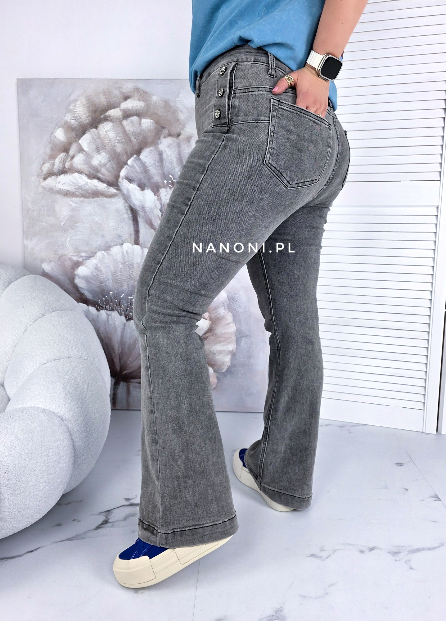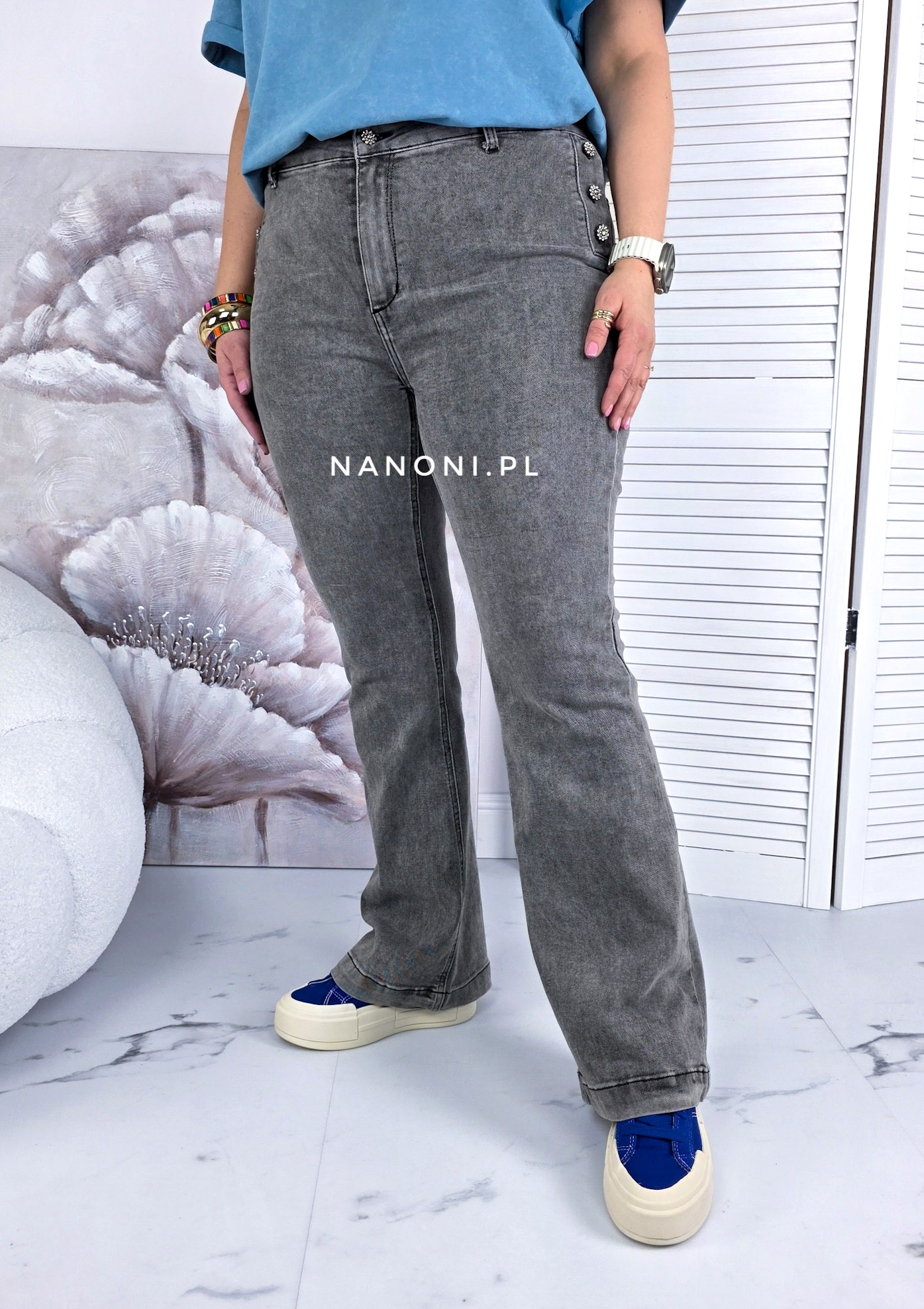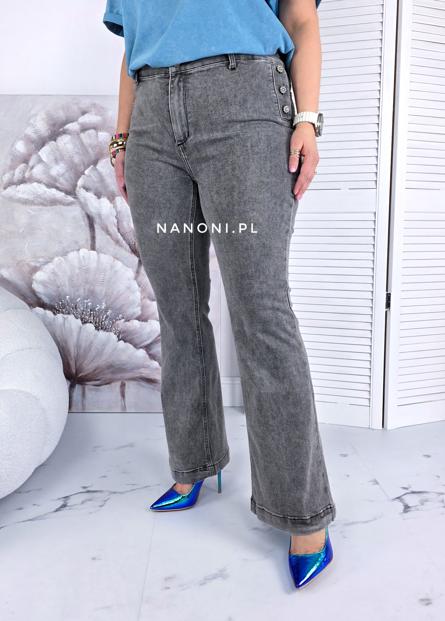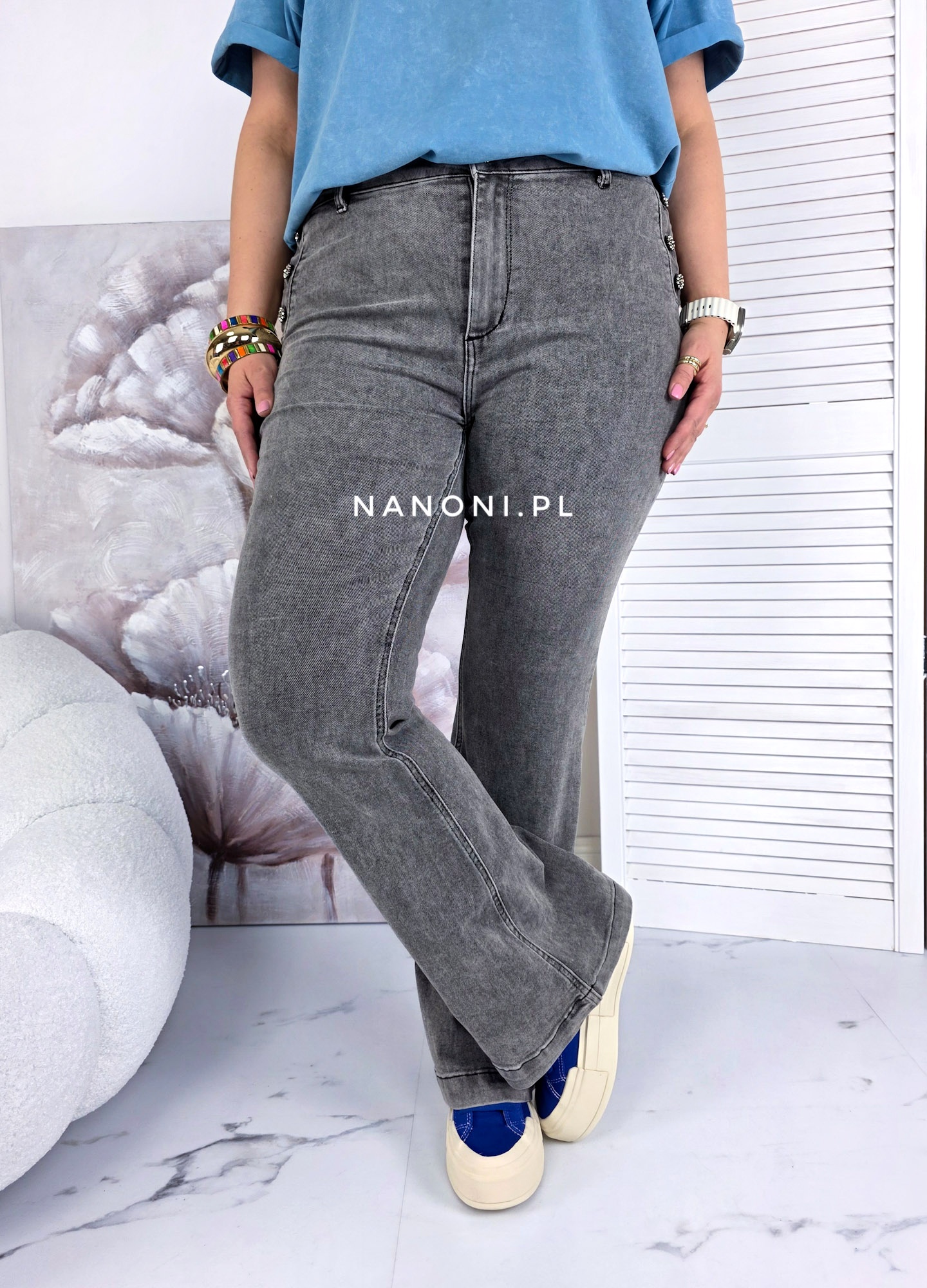 Spodnie jeansy dzwony szare plus size model. Spodnie są ze średniej grubości jeansu.